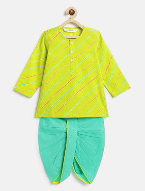 Campana Boys Bansi Dhoti Kurta Set - Leheriya Print - Lime Green & Turquoise