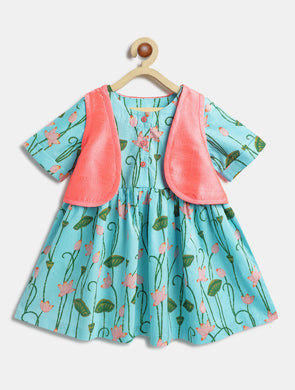 Campana Girls Zoe Cotton Dress with Short Jacket - Lotus Print - Light Blue & Pink