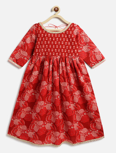 Campana Girls Madhuri Long Cotton Kurta - Blockprint - Maroon & Pink