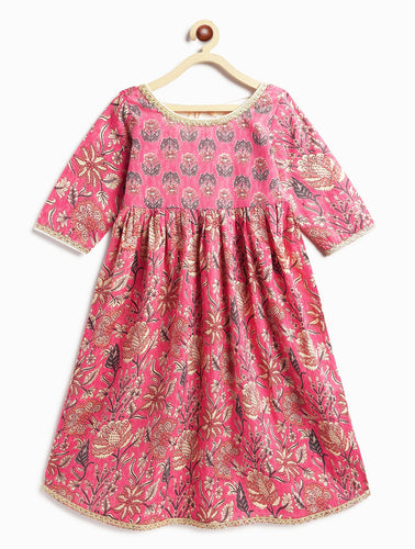 Campana Girls Madhuri Long Cotton Kurta - Blockprint - Cloudy Pink