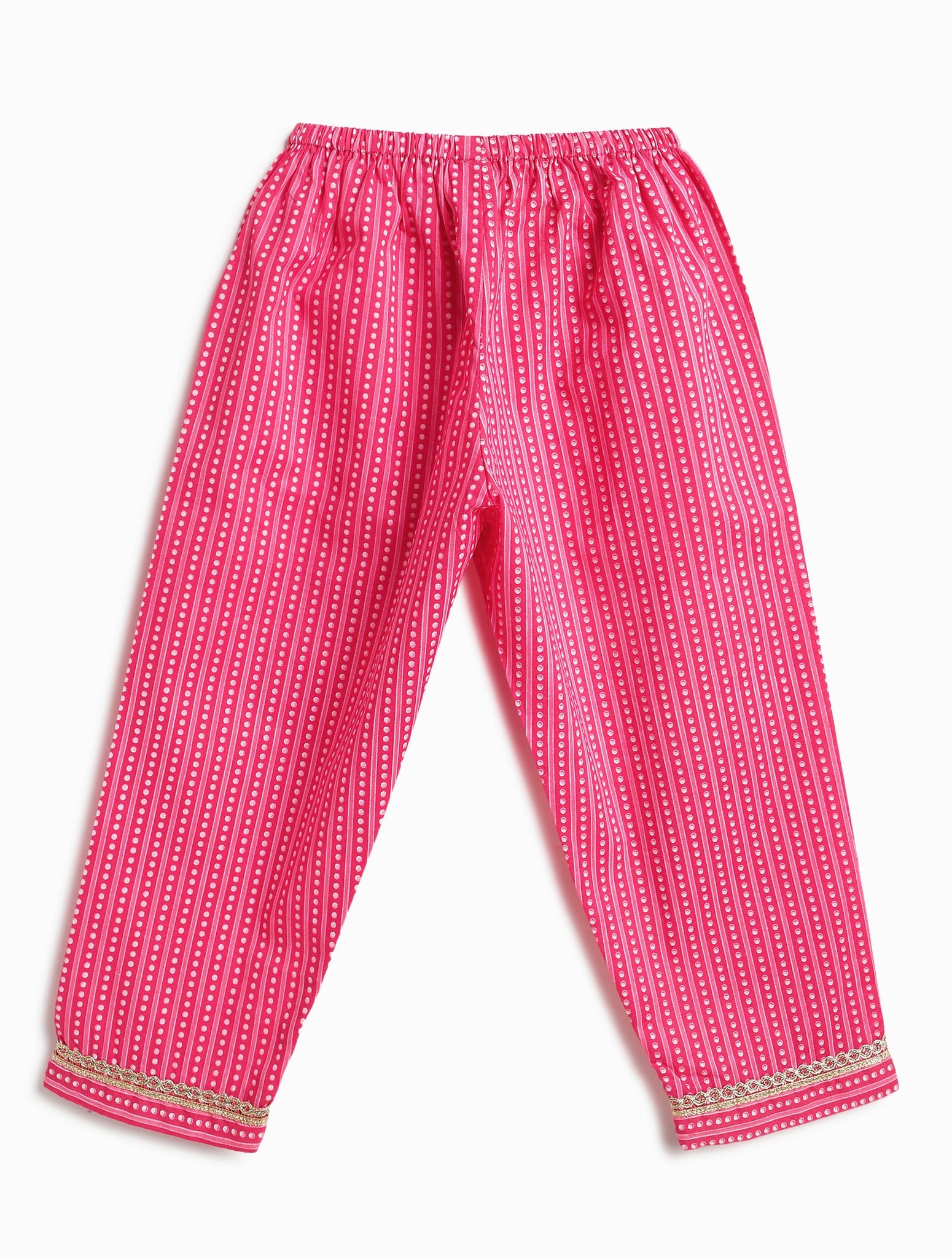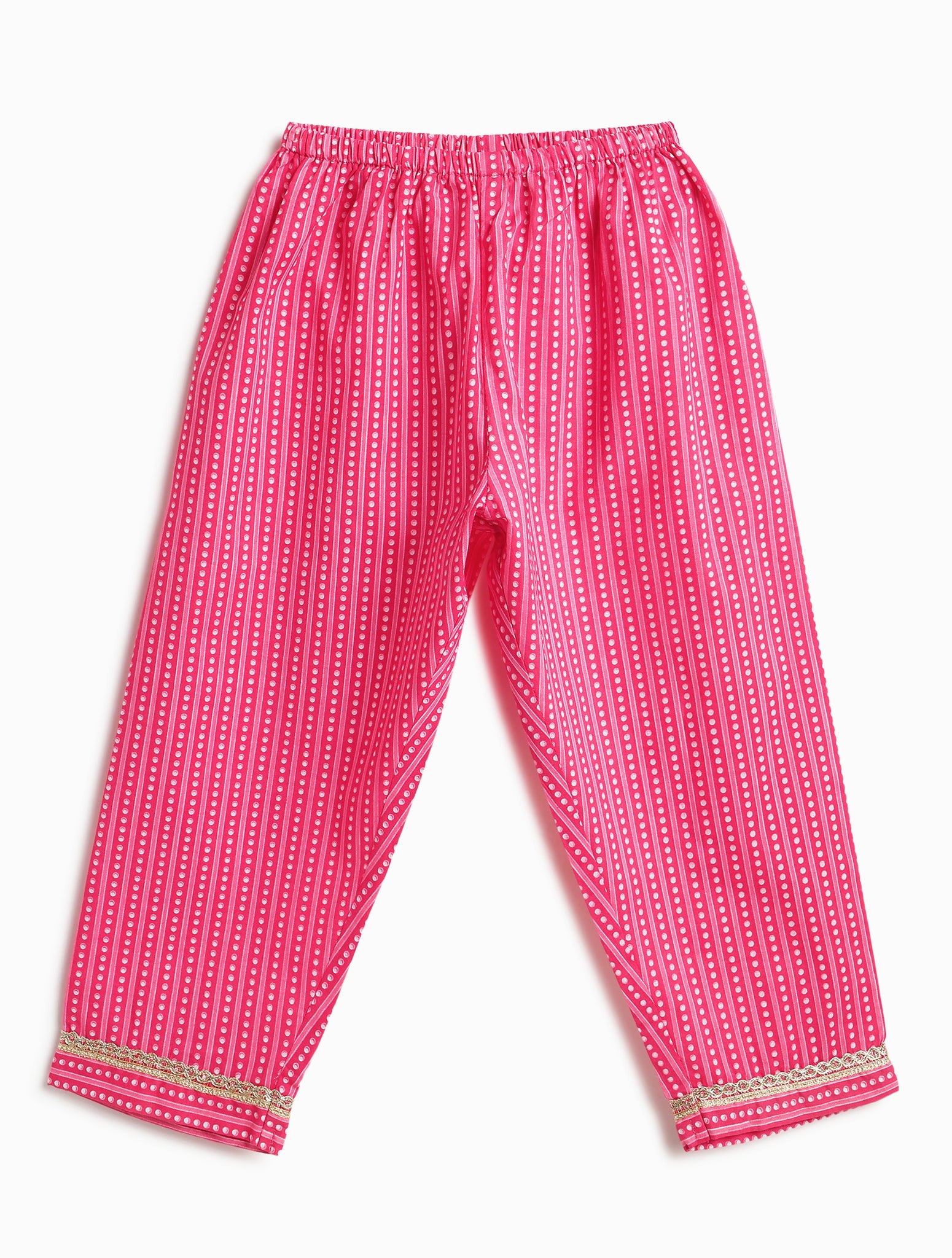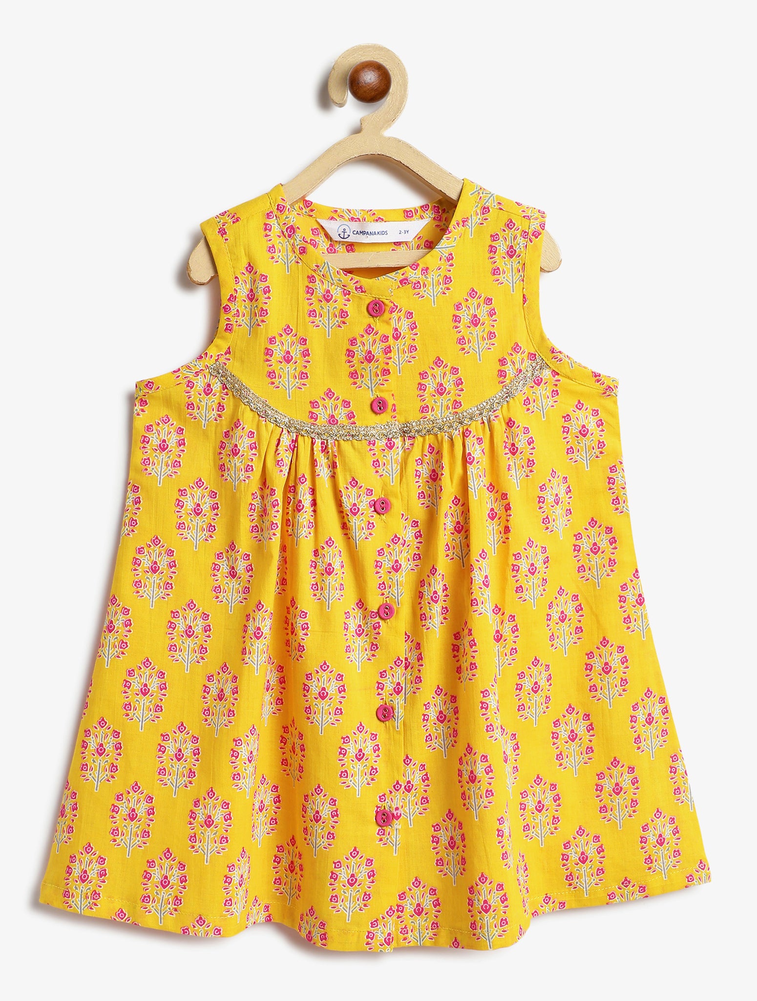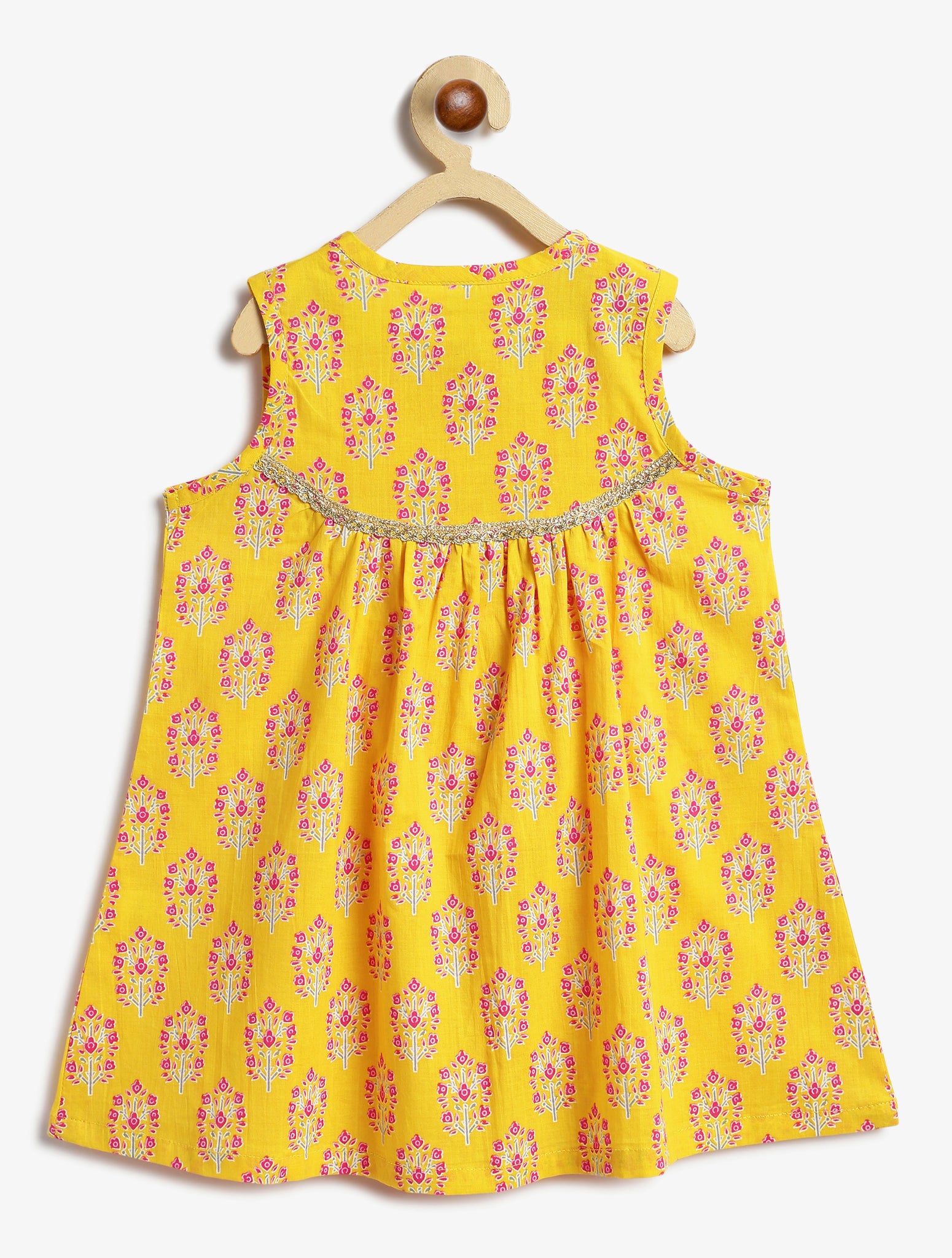 Yellow & pink block print girls kurti pants set in pure cotton fabric.