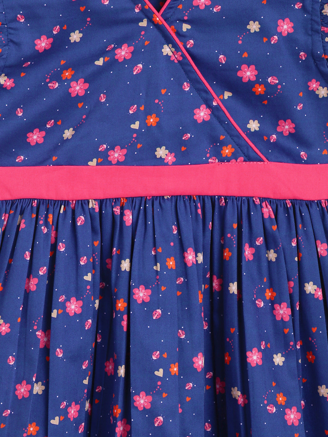 Navy floral print short sleeves dress for girls in 100% cotton fabric.