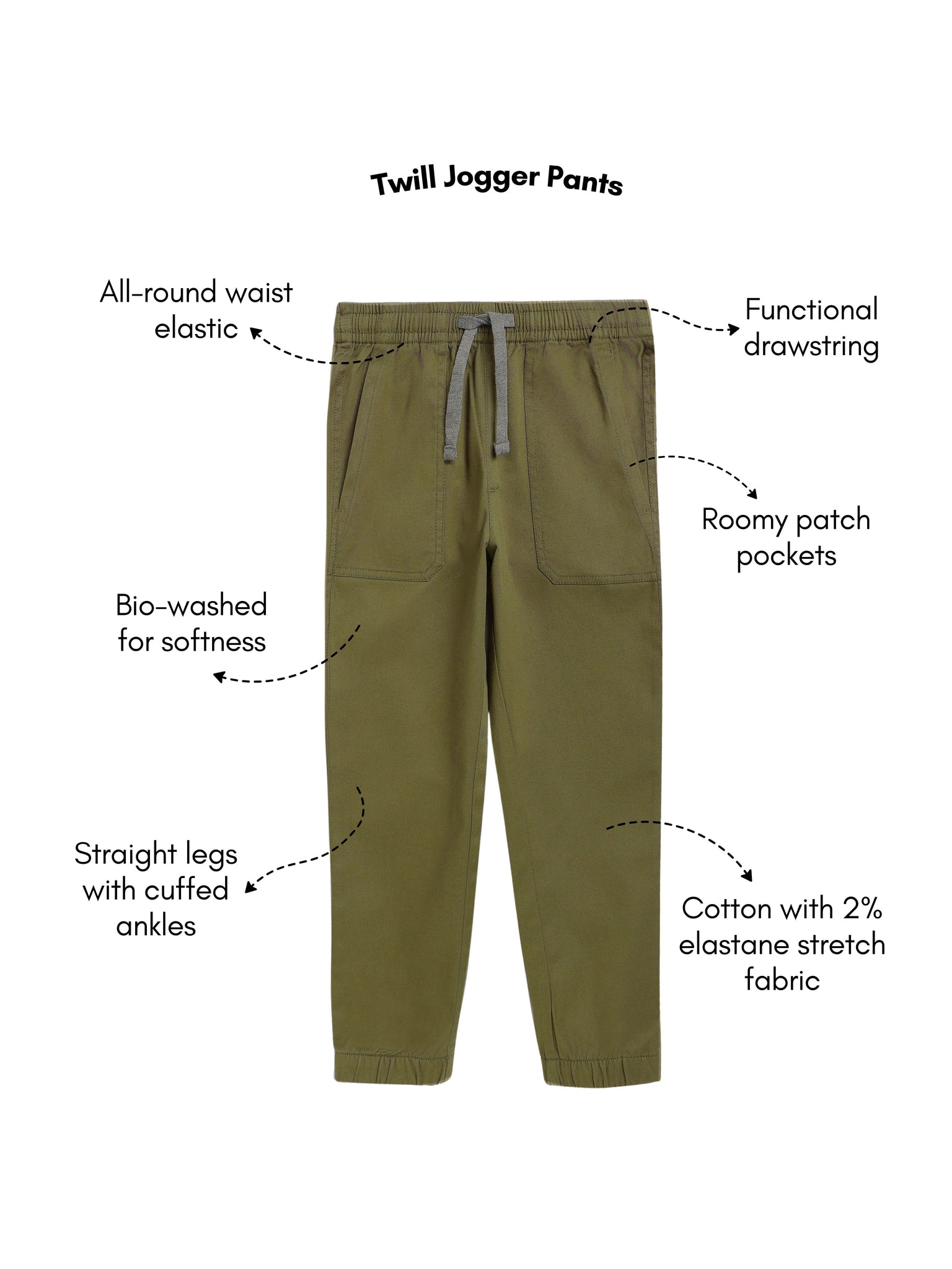 The waist has all-round elastic with a functional drawstring.