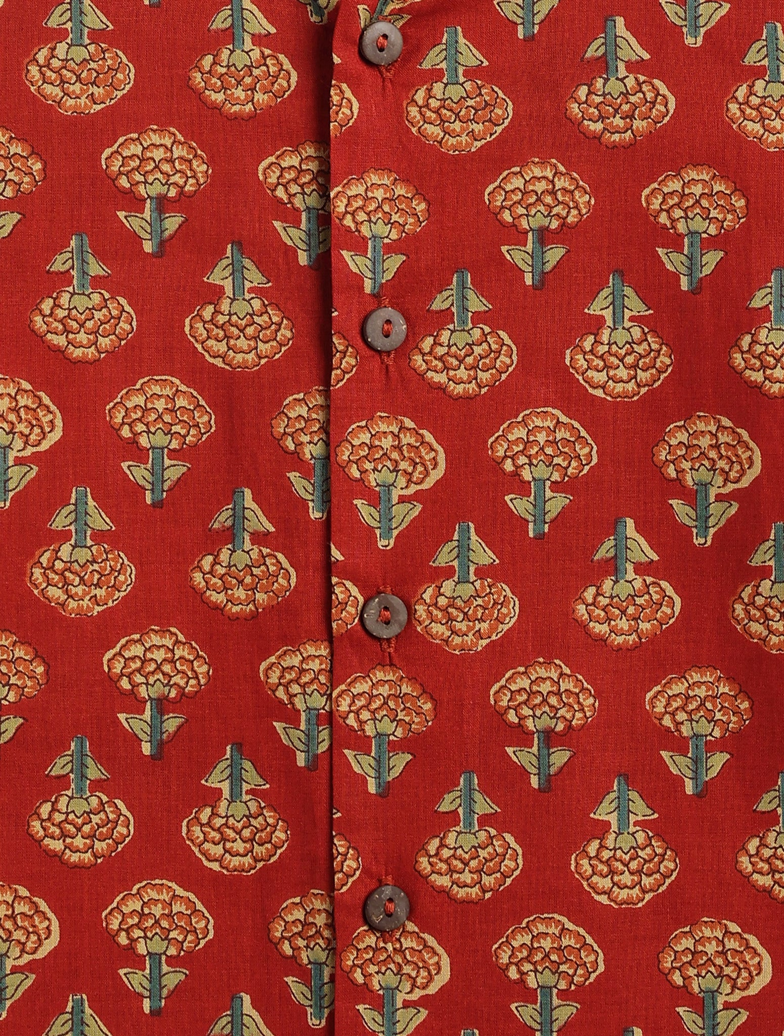 Red & beige floral printed boys kurta set in pure cotton fabric