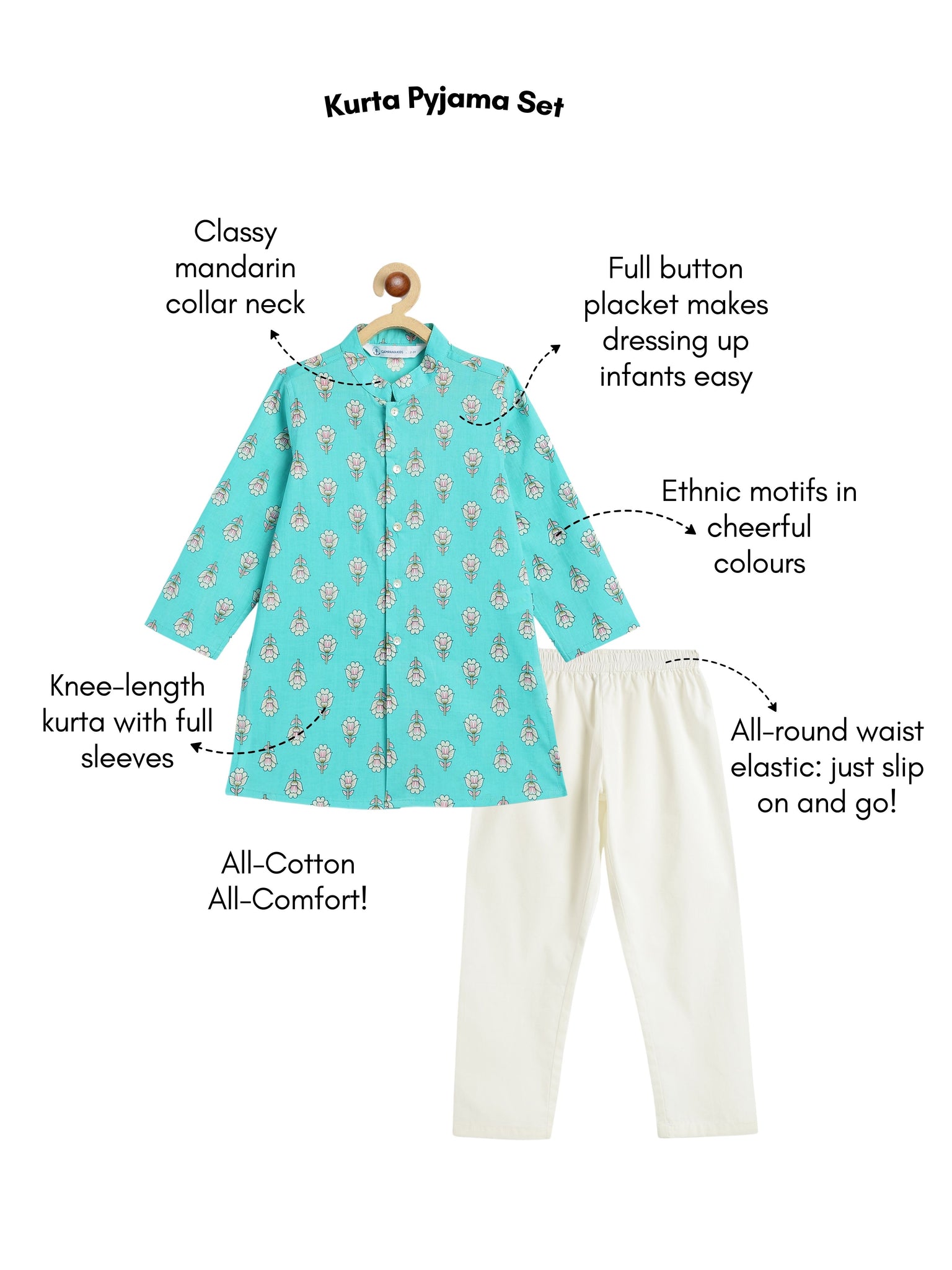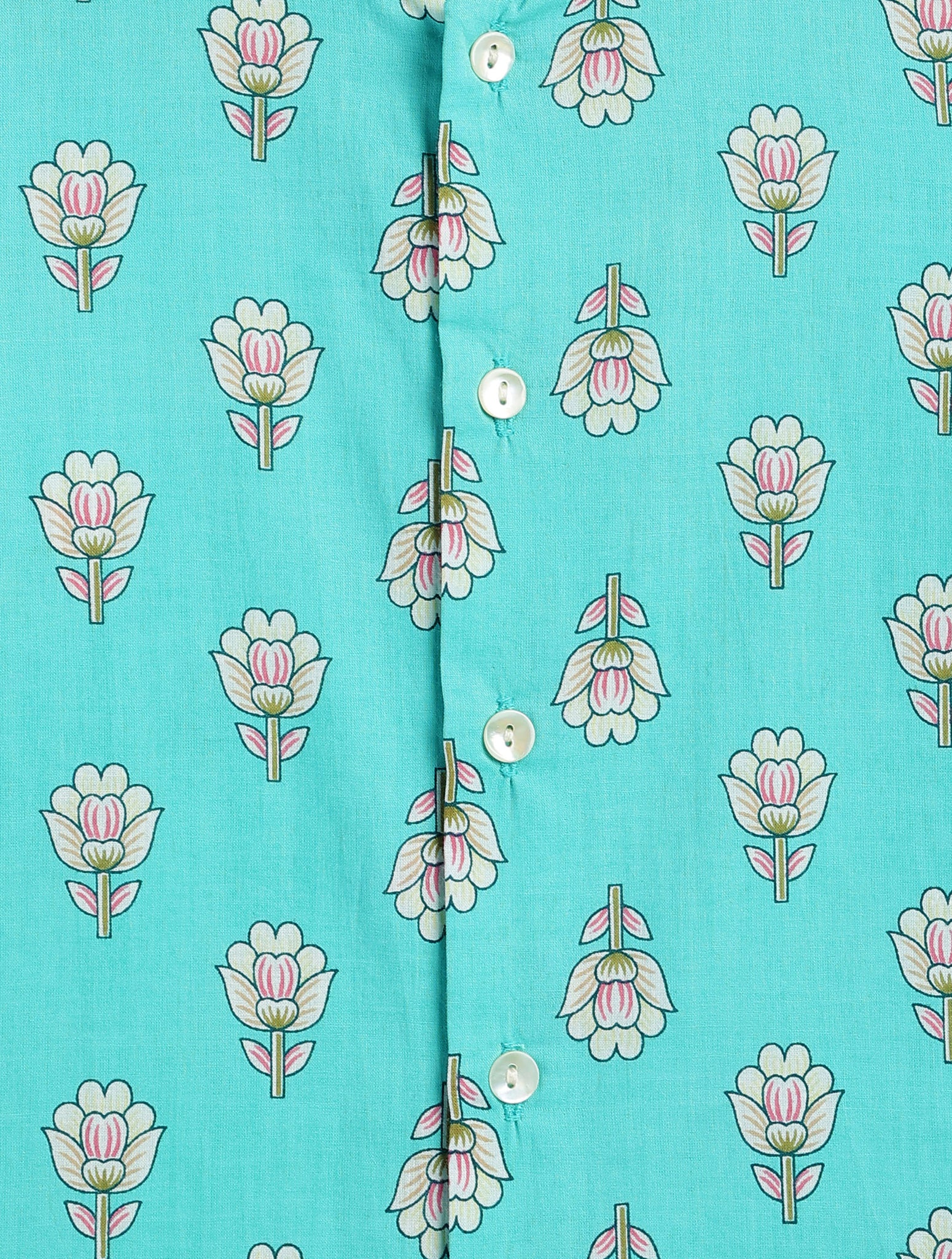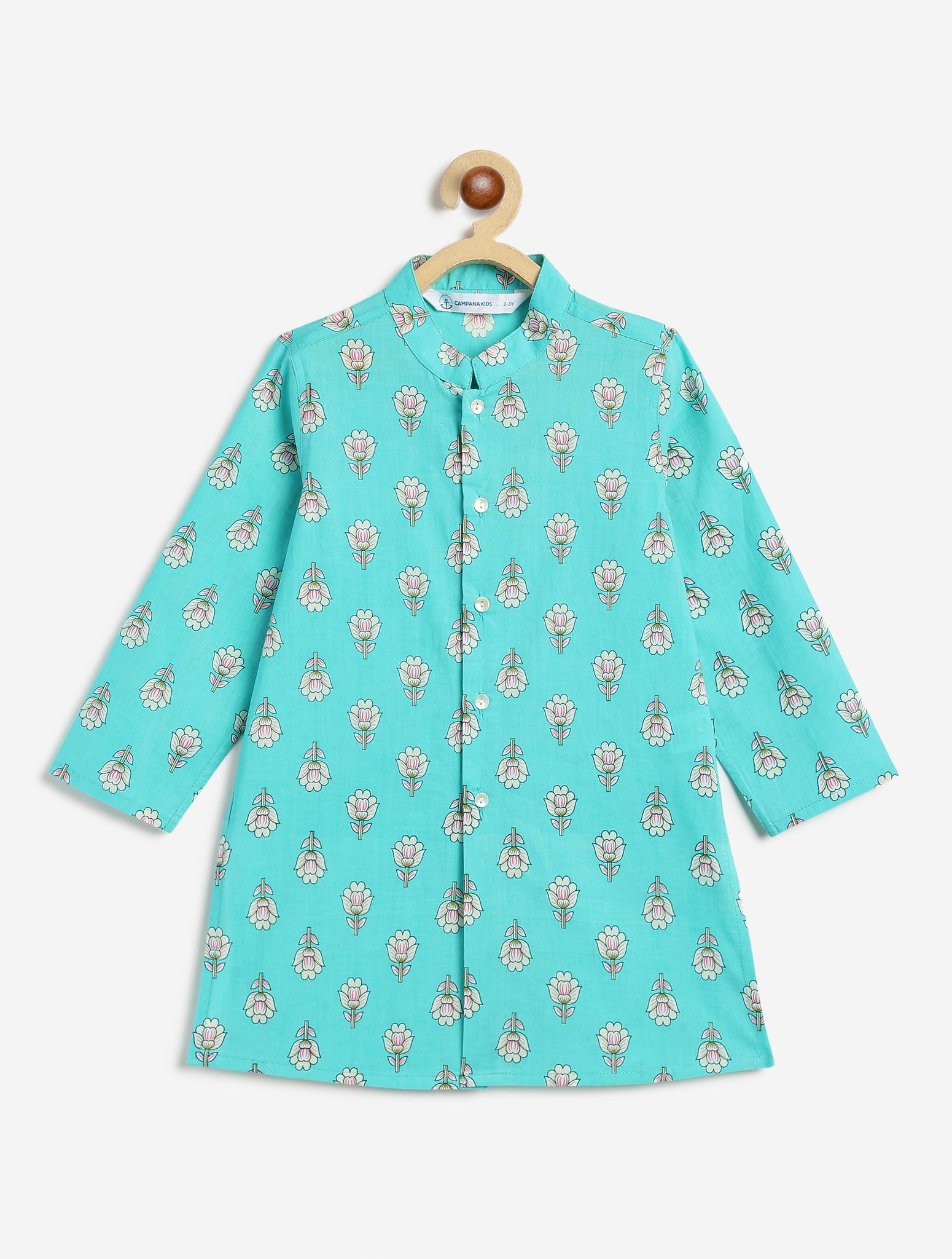 Turquoise blue floral printed boys kurta set in pure cotton fabric