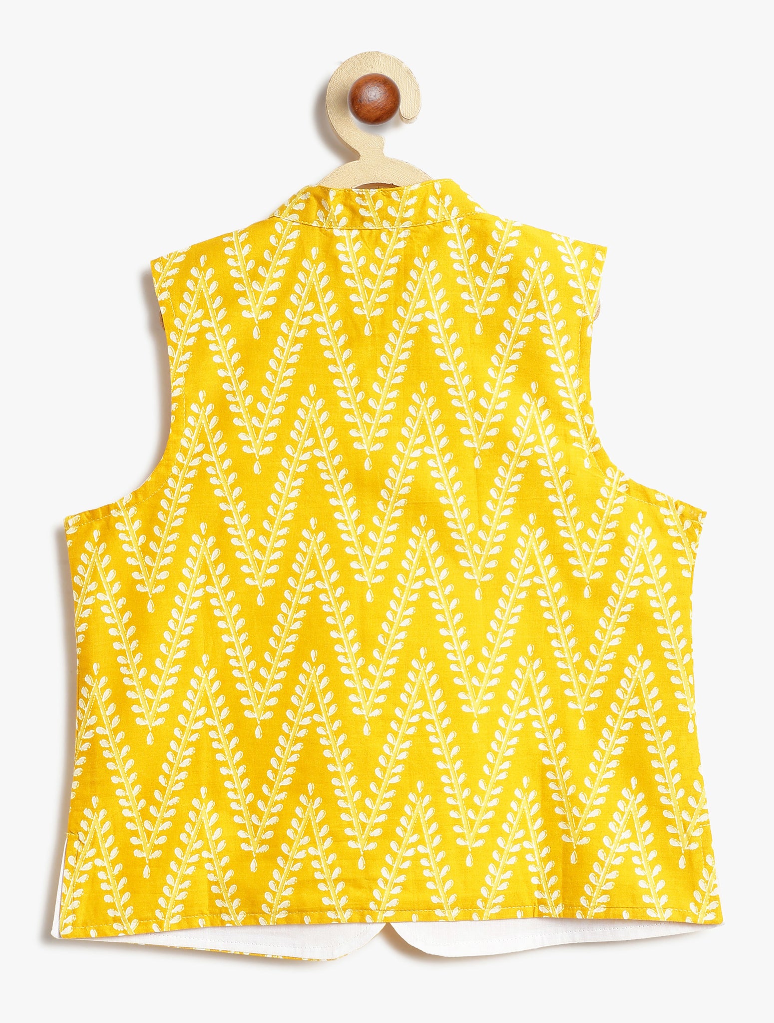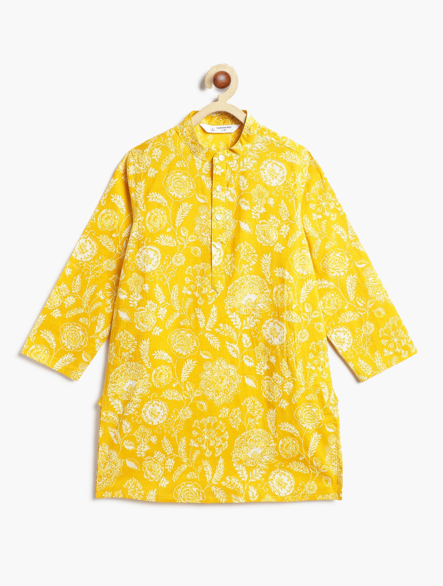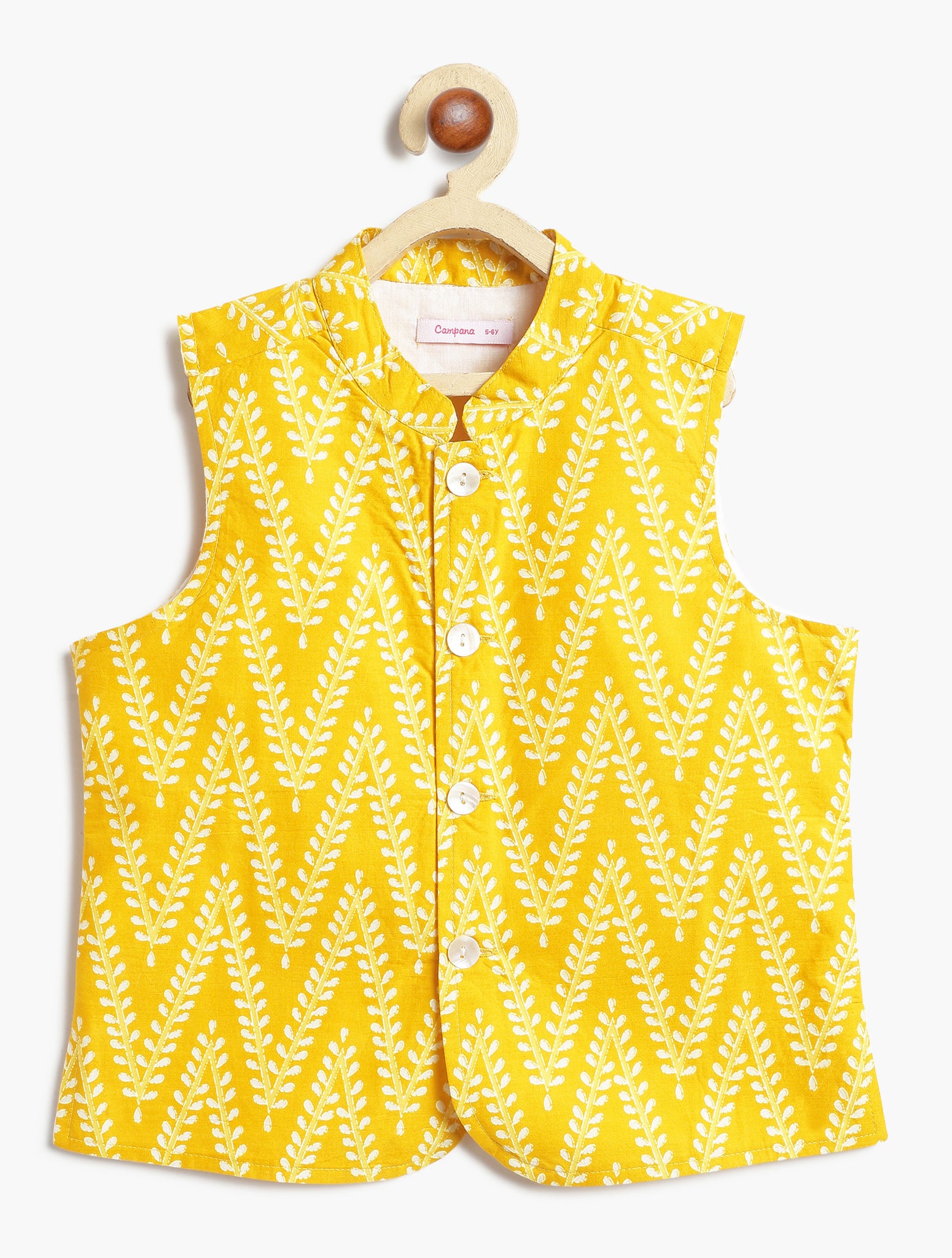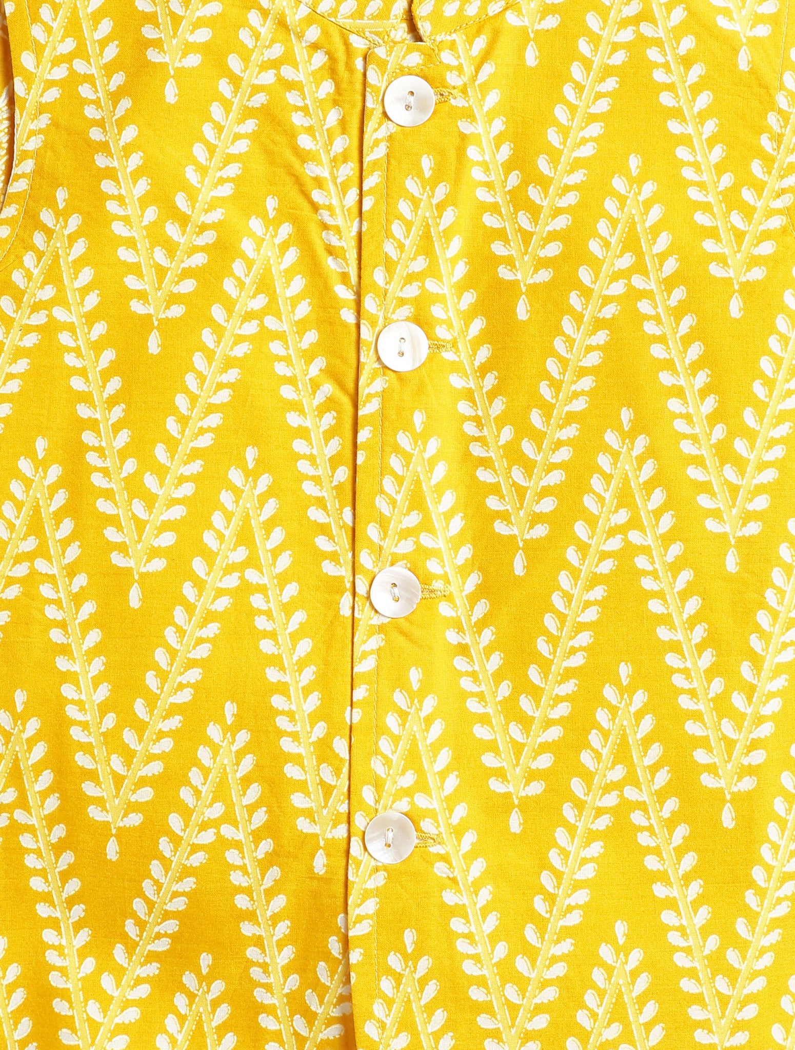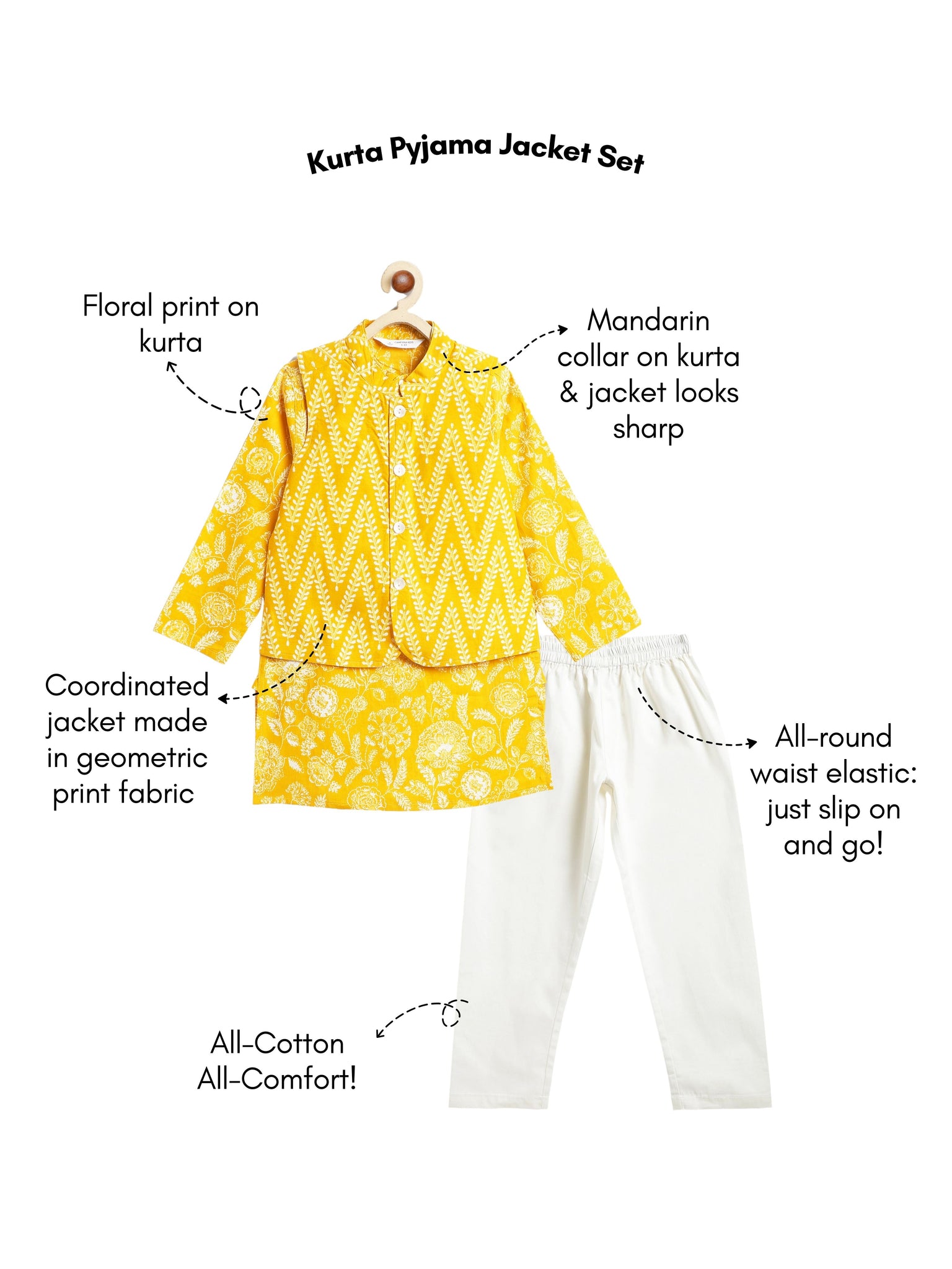 Yellow floral & zigzag printed boys kurta set in pure cotton fabric