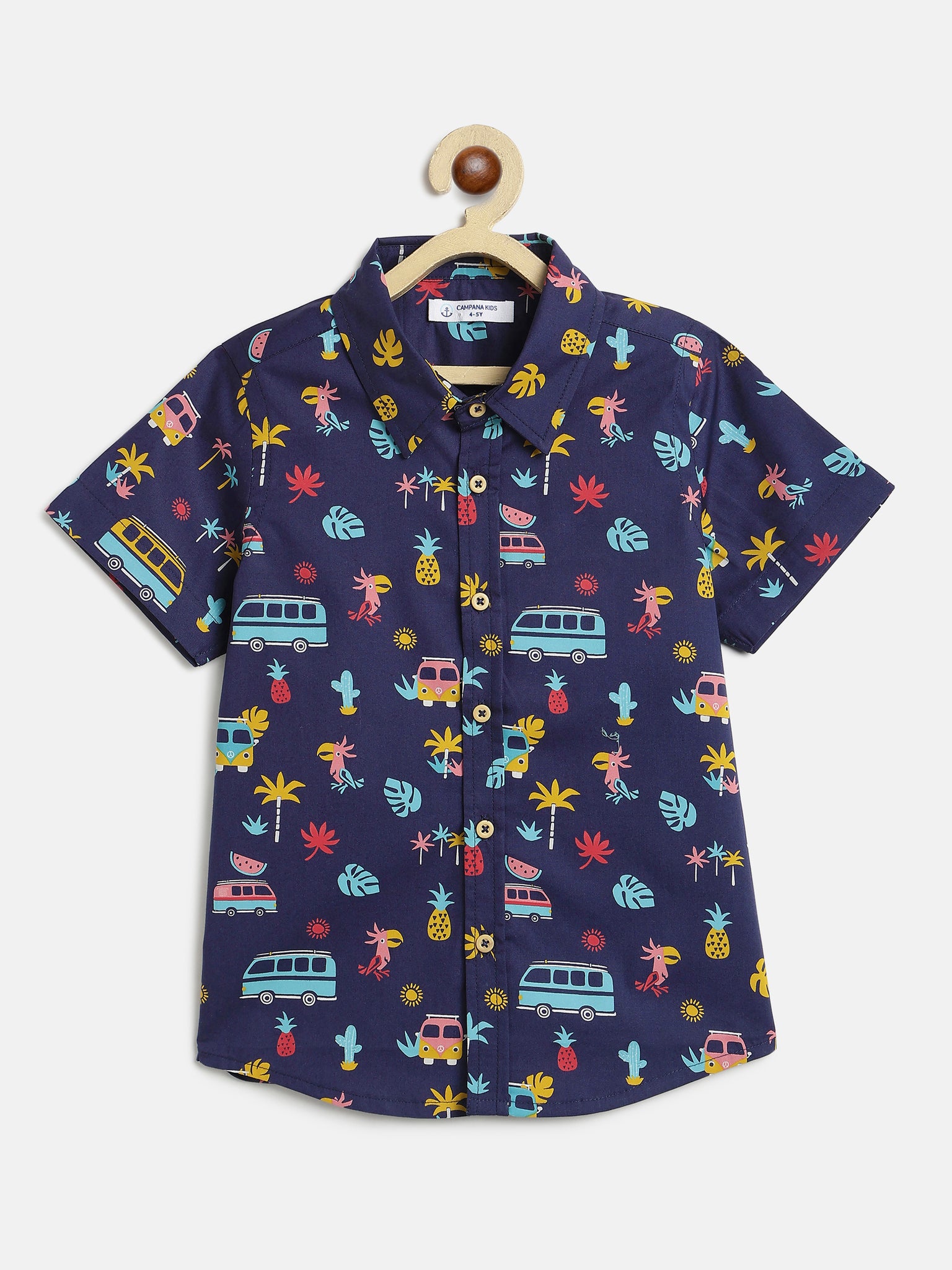 Navy blue printed short sleeves shirt for boys in pure cotton fabric.
