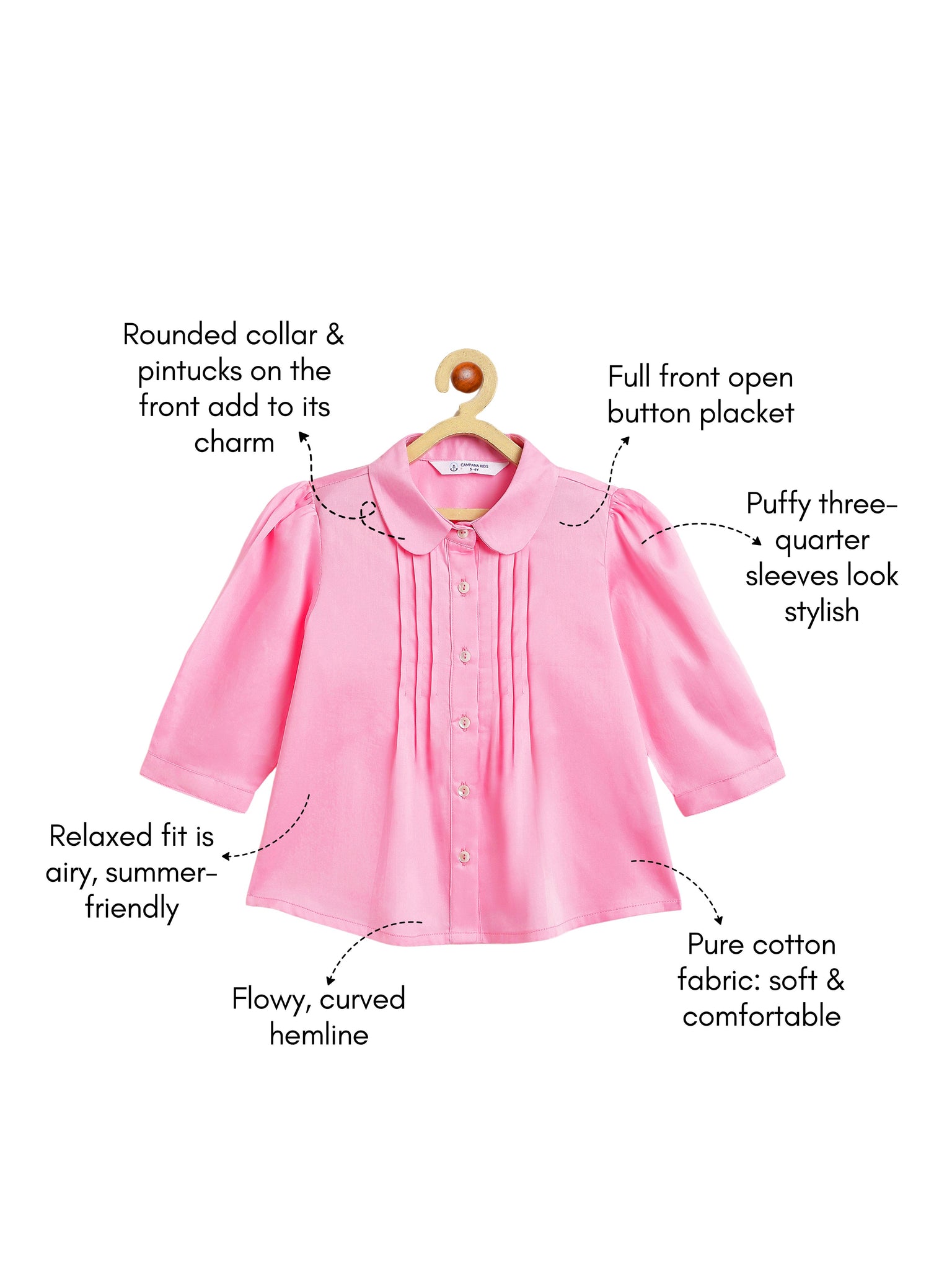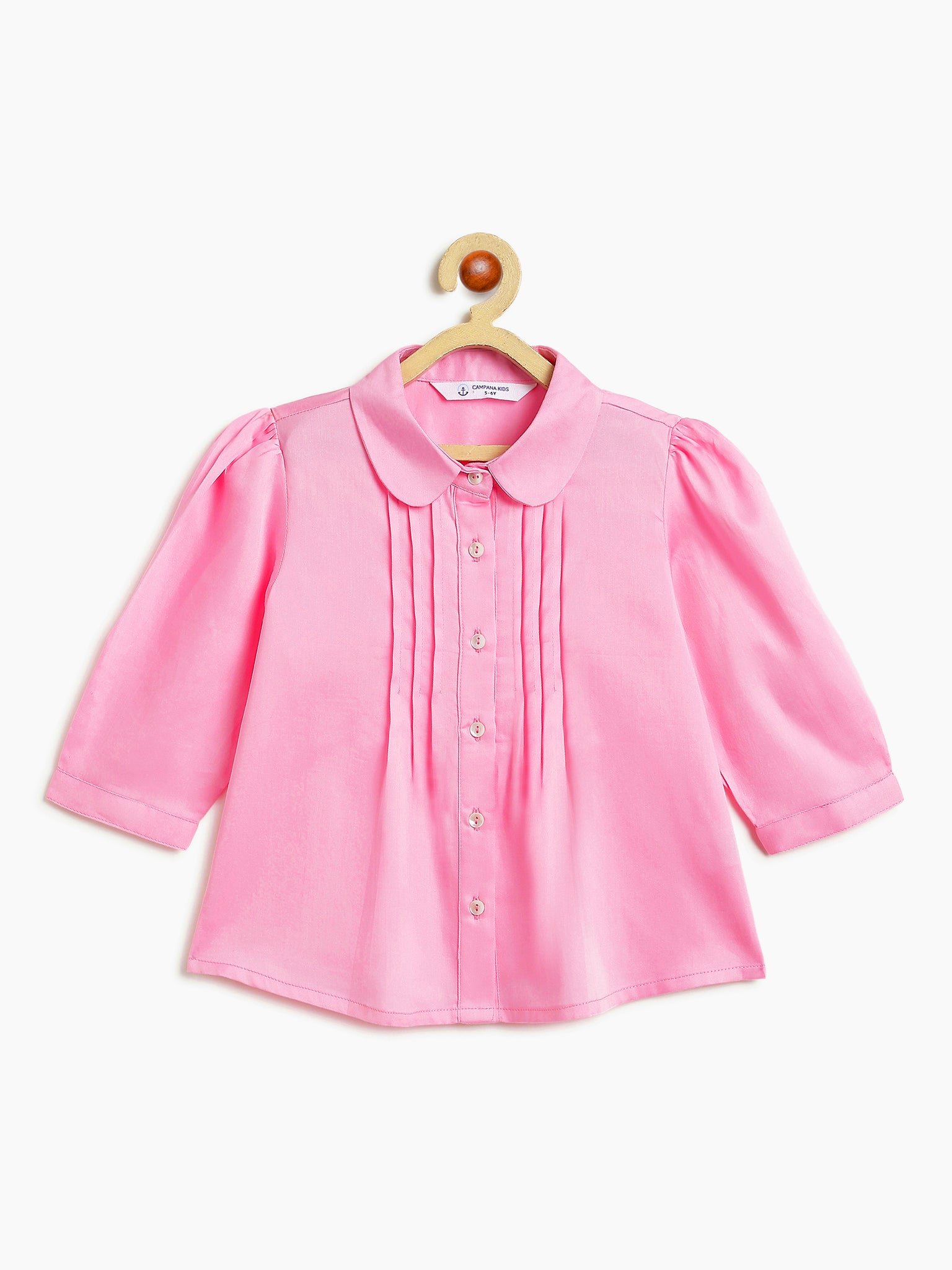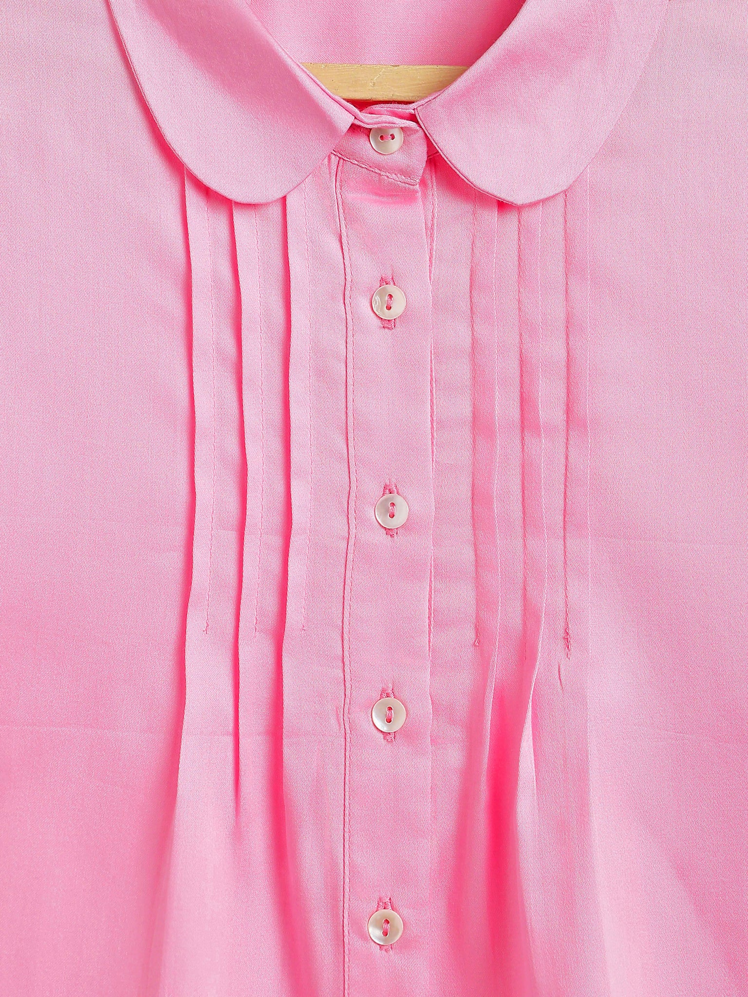 It has a rounded collar, front pleats and shirt style buttons with three-fourth sleeves.
