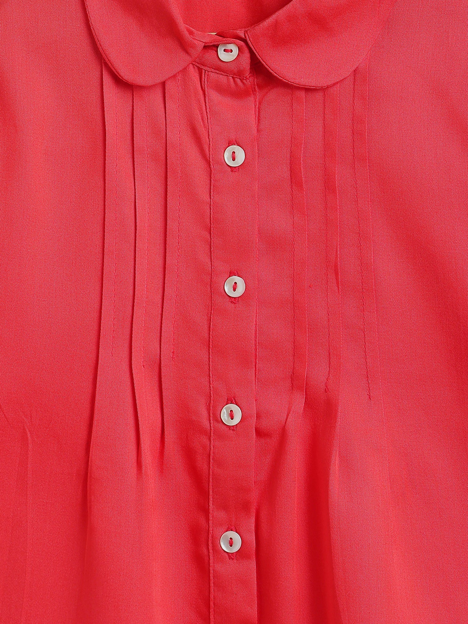 It has a rounded collar, front pleats and shirt style buttons with three-fourth sleeves.