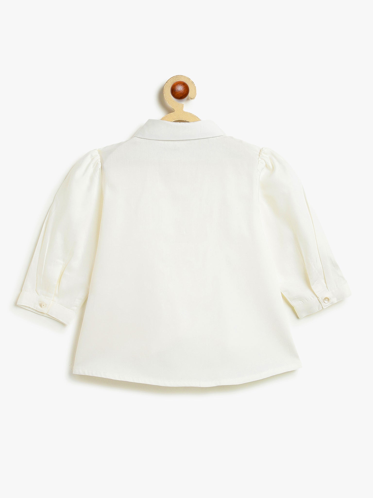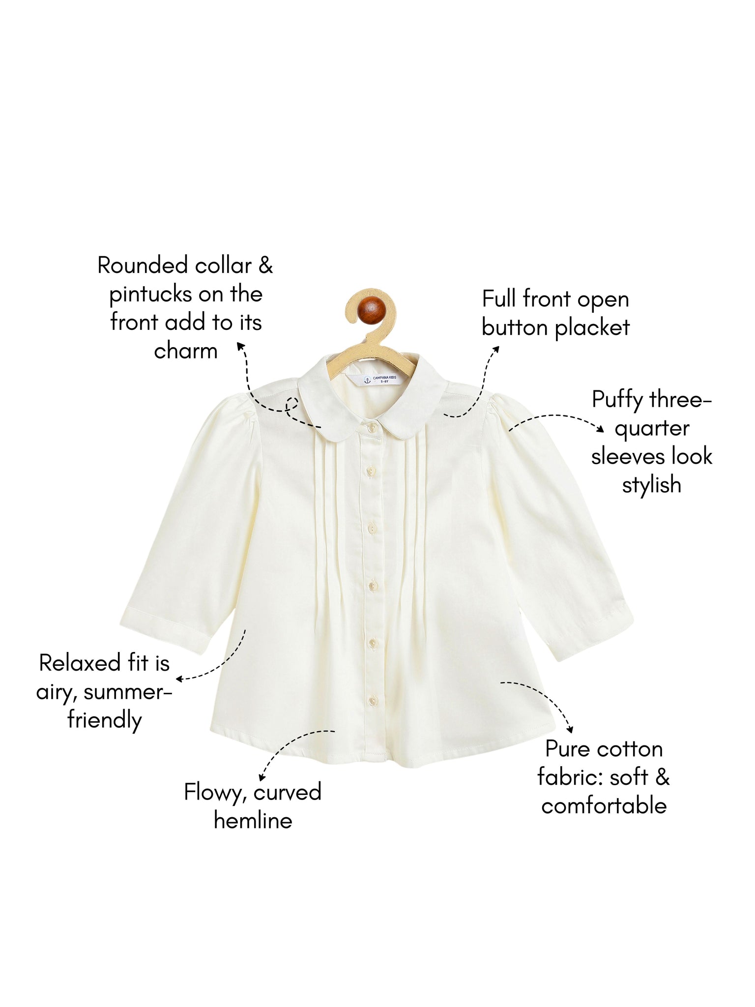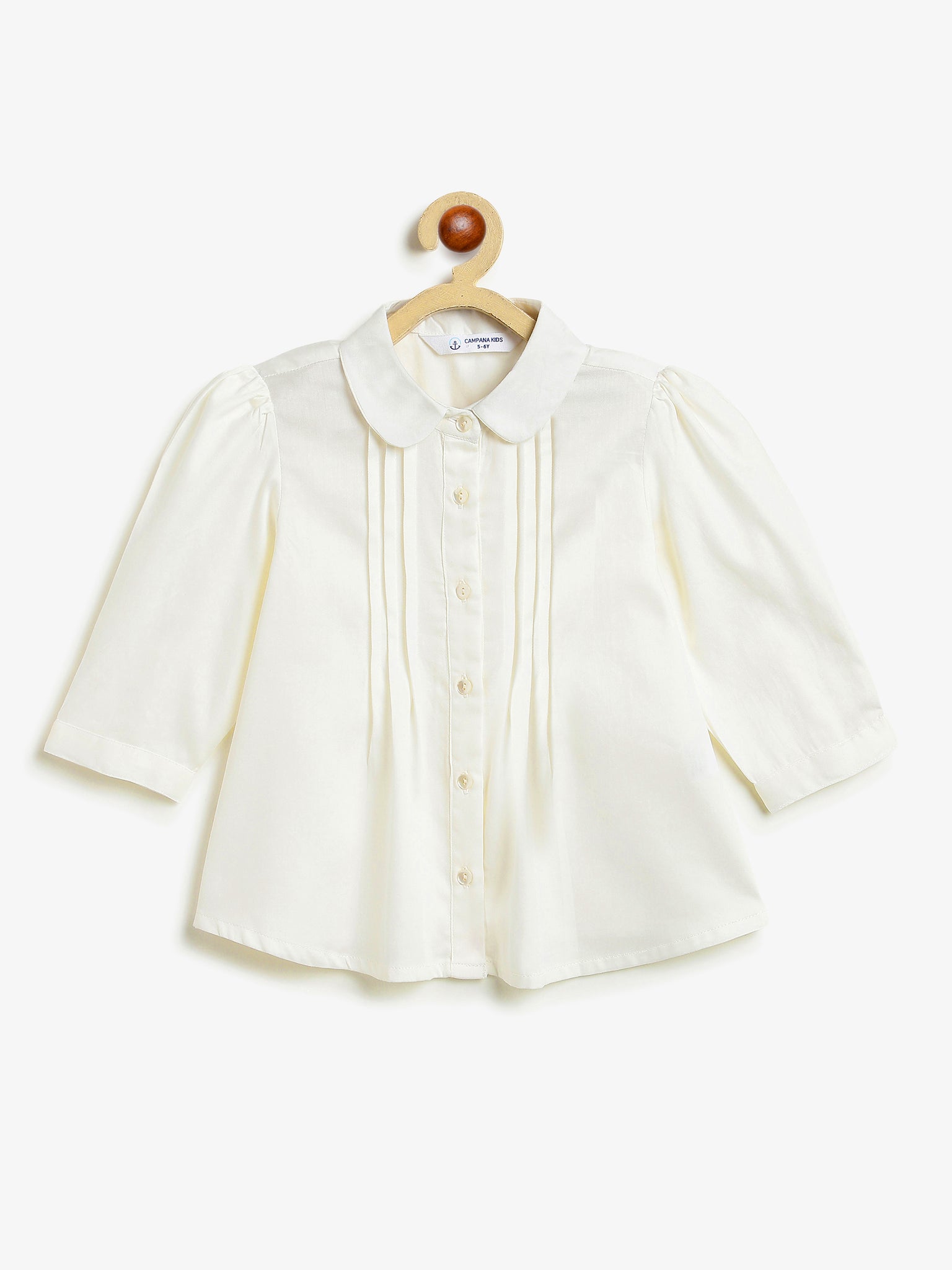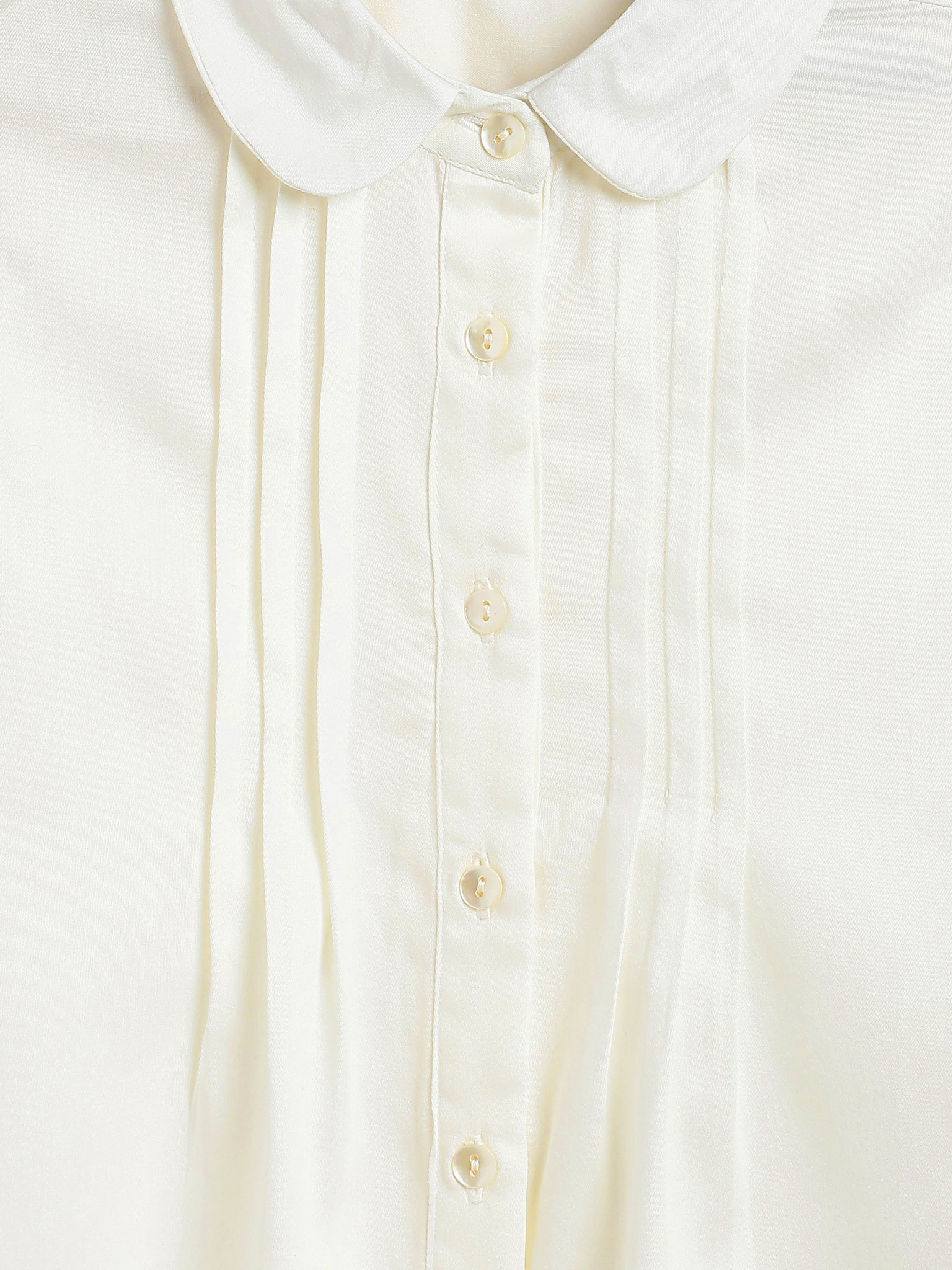 It has a rounded collar, front pleats and shirt style buttons with three-fourth sleeves.