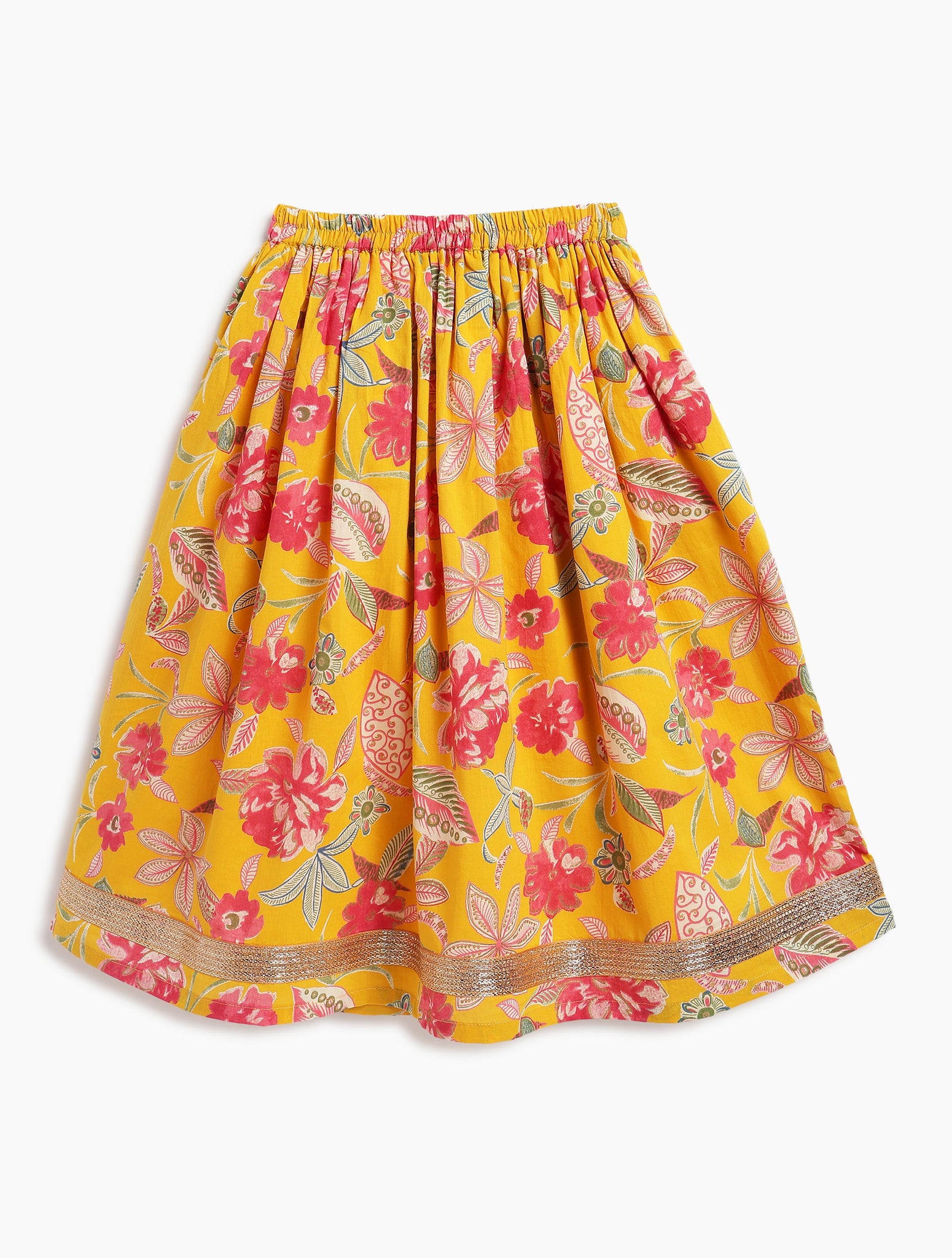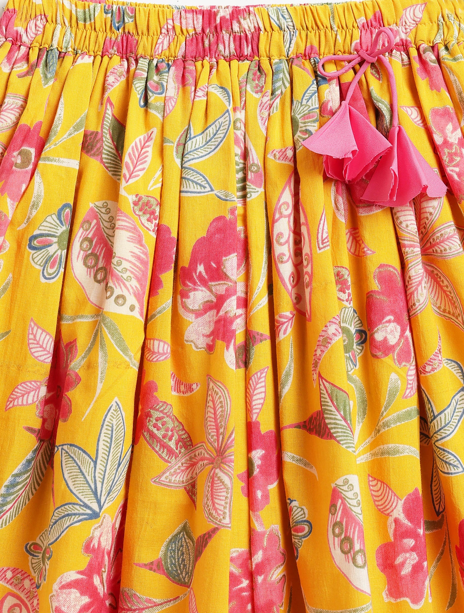 Campana Girls Bela Cotton Lehenga Choli Set - Floral Block & Jaal Print - Yellow & Pink