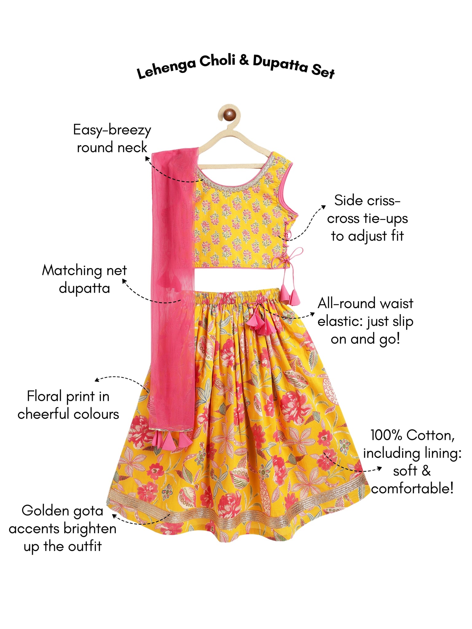 Yellow & pink floral printed girls lehenga choli set in pure cotton fabric.