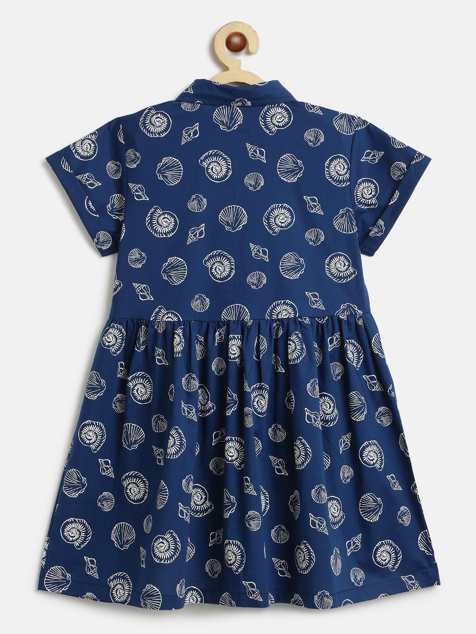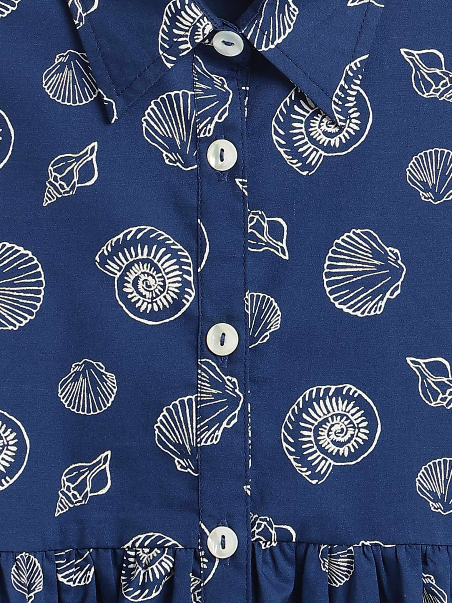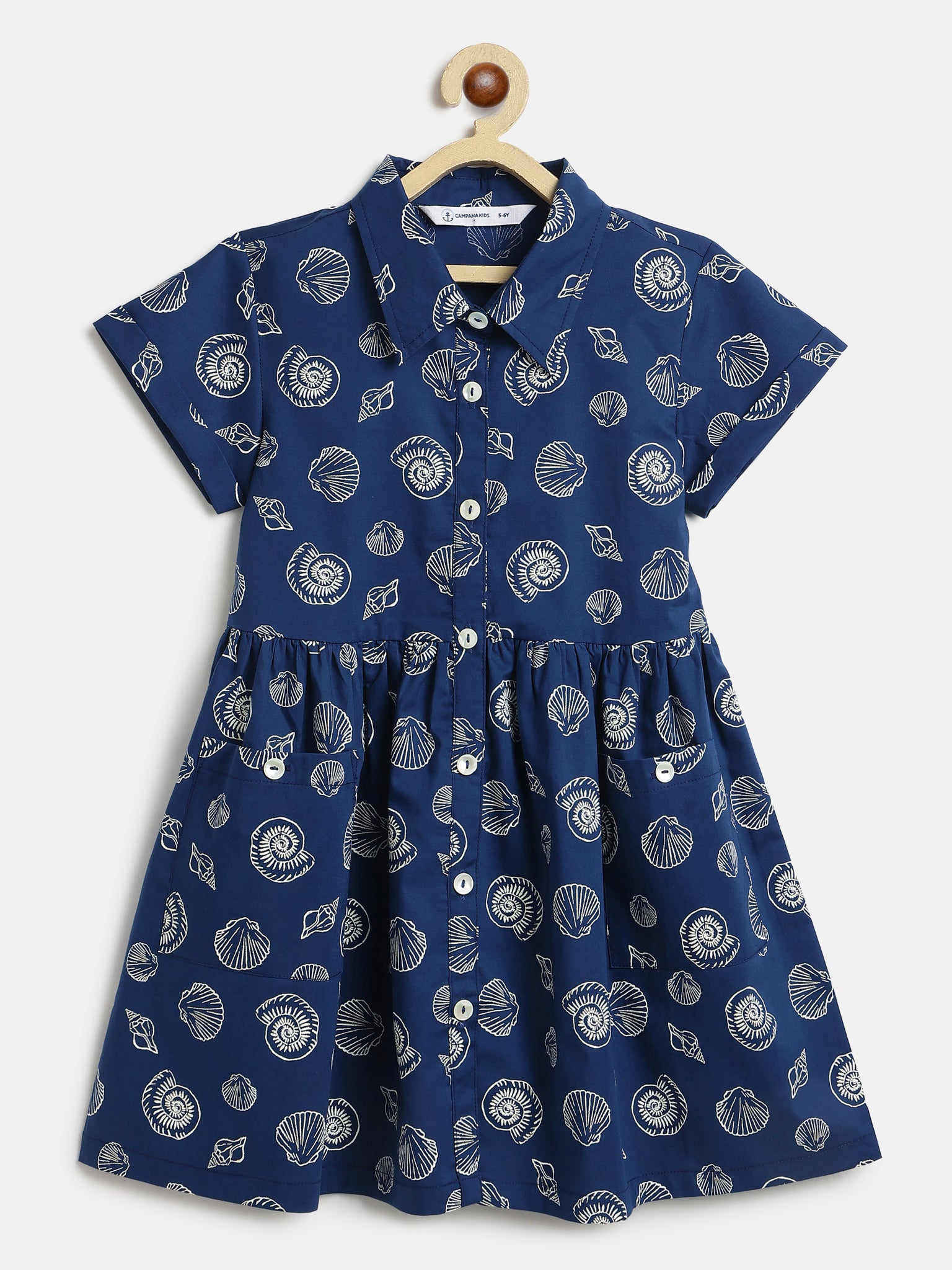 Navy blue seashells printed dress for girls in 100% cotton fabric.