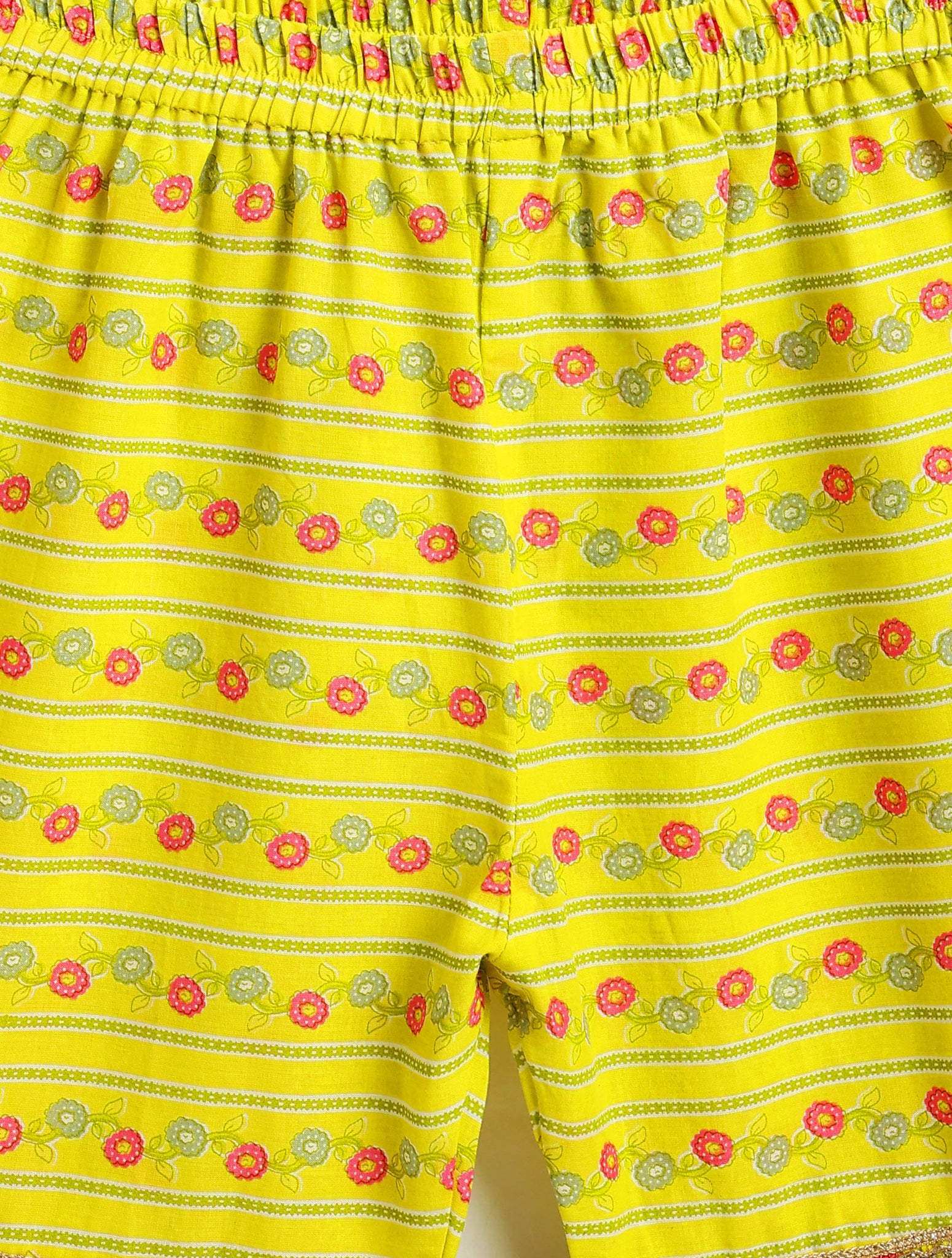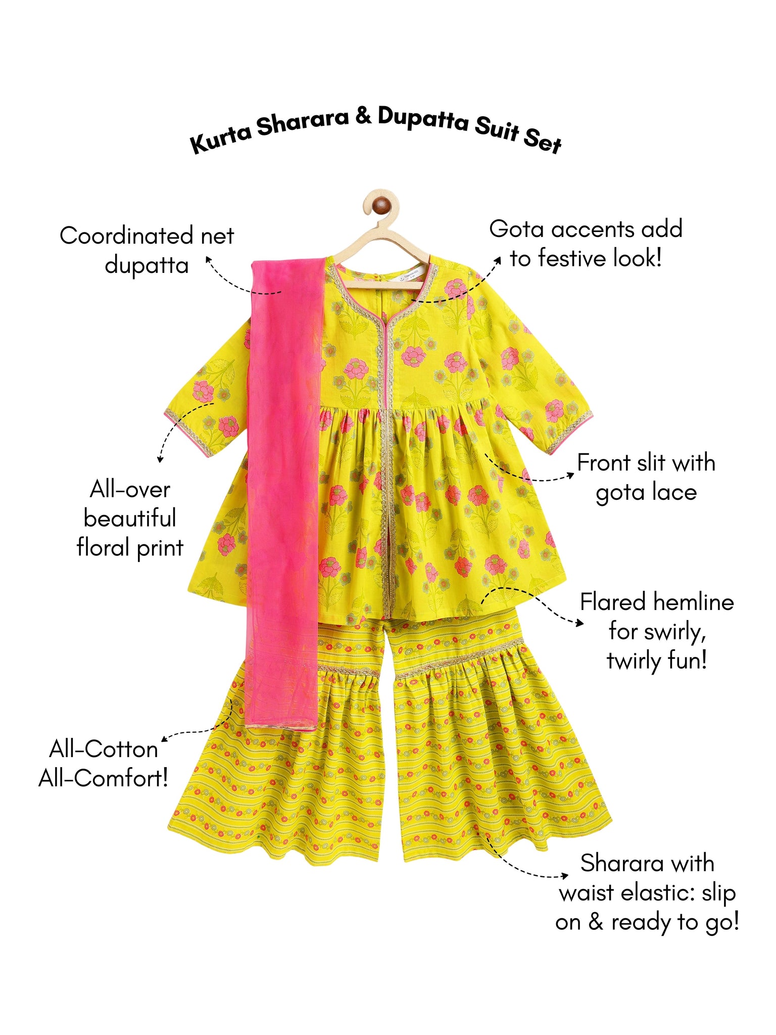 Lime green & pink floral printed girls kurta set in pure cotton fabric.