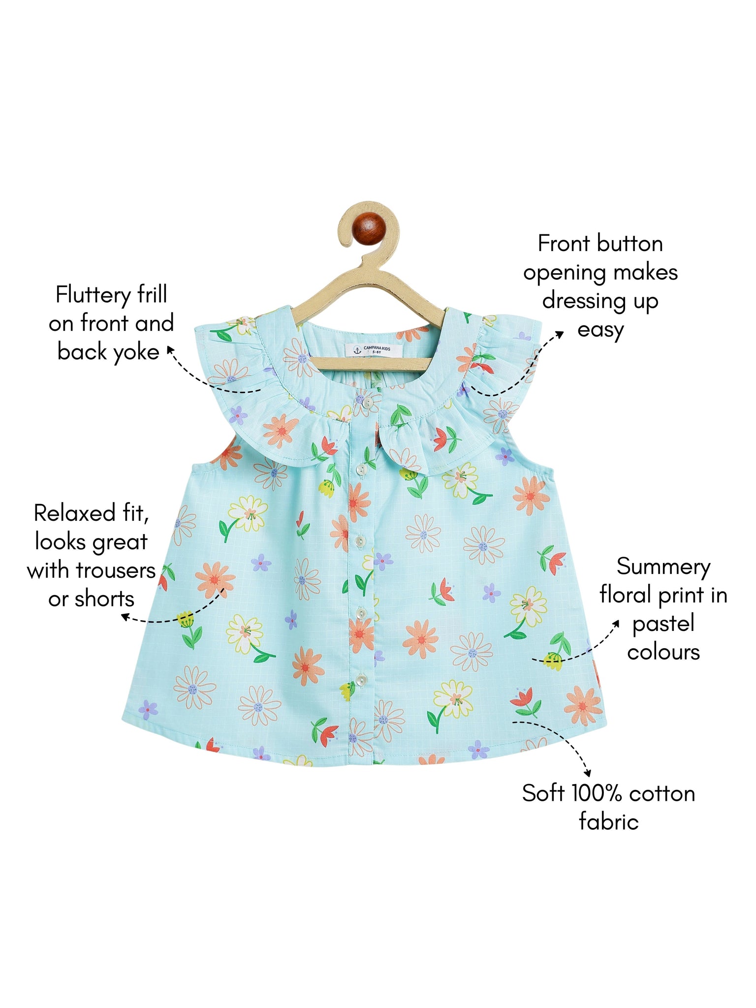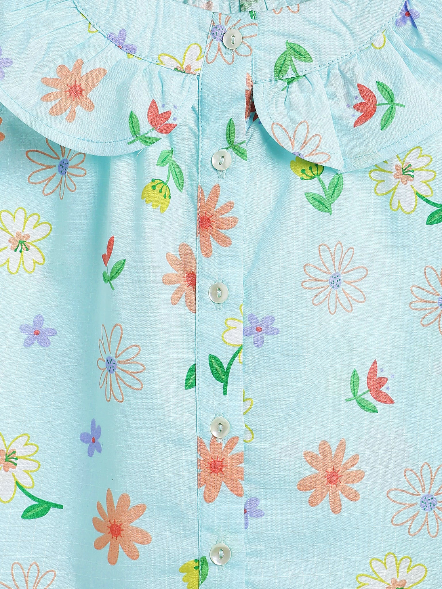It has a round neck and frilled yoke with front button opening.
