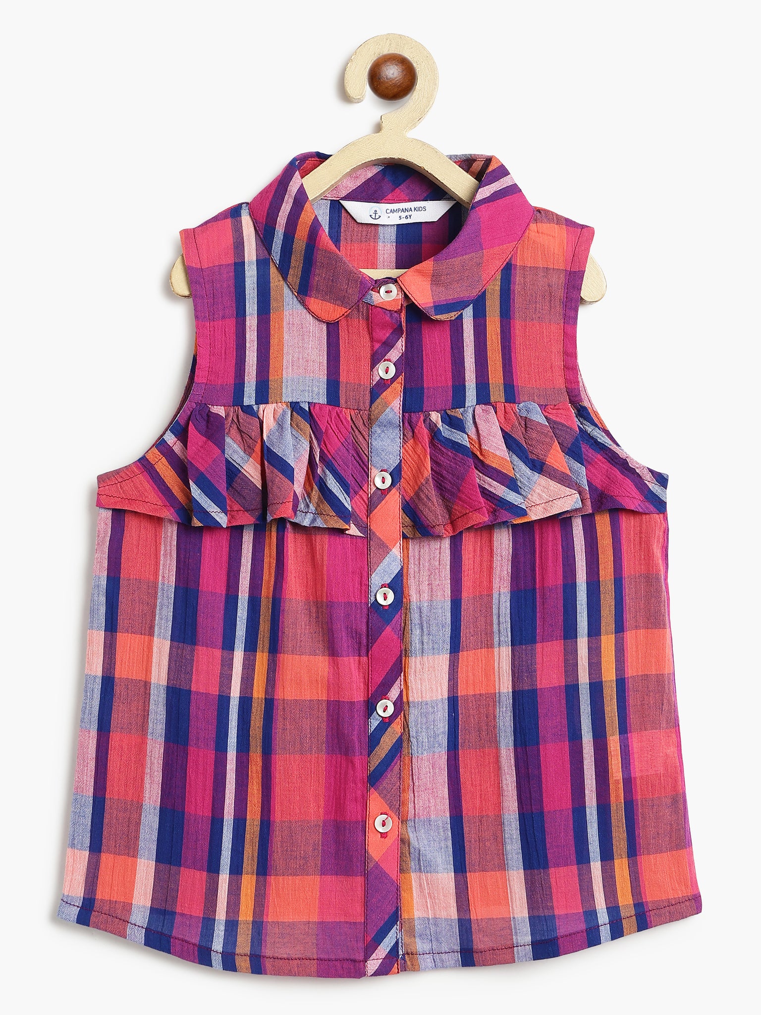 Navy and pink checked sleeveless top for girls in 100% cotton fabric.