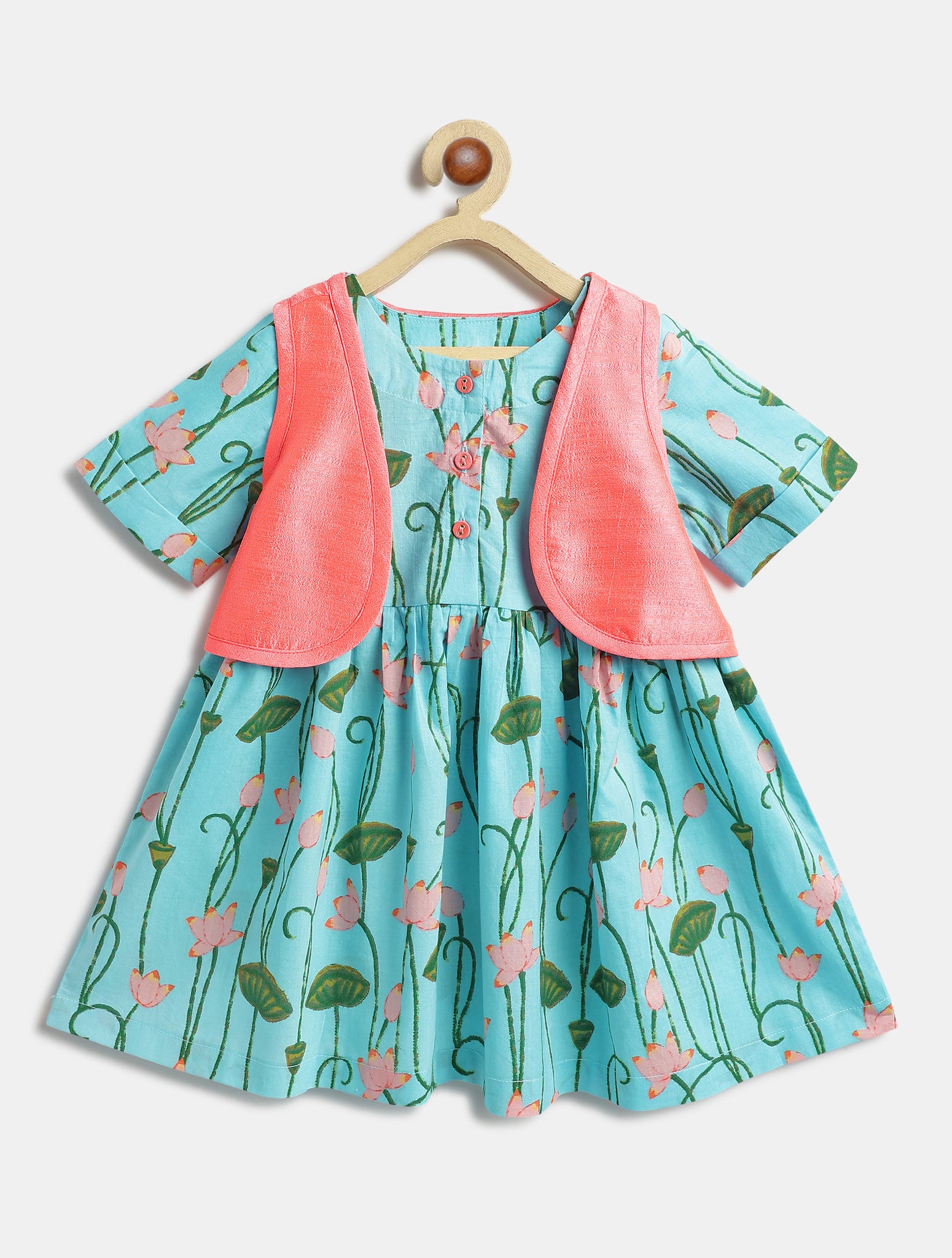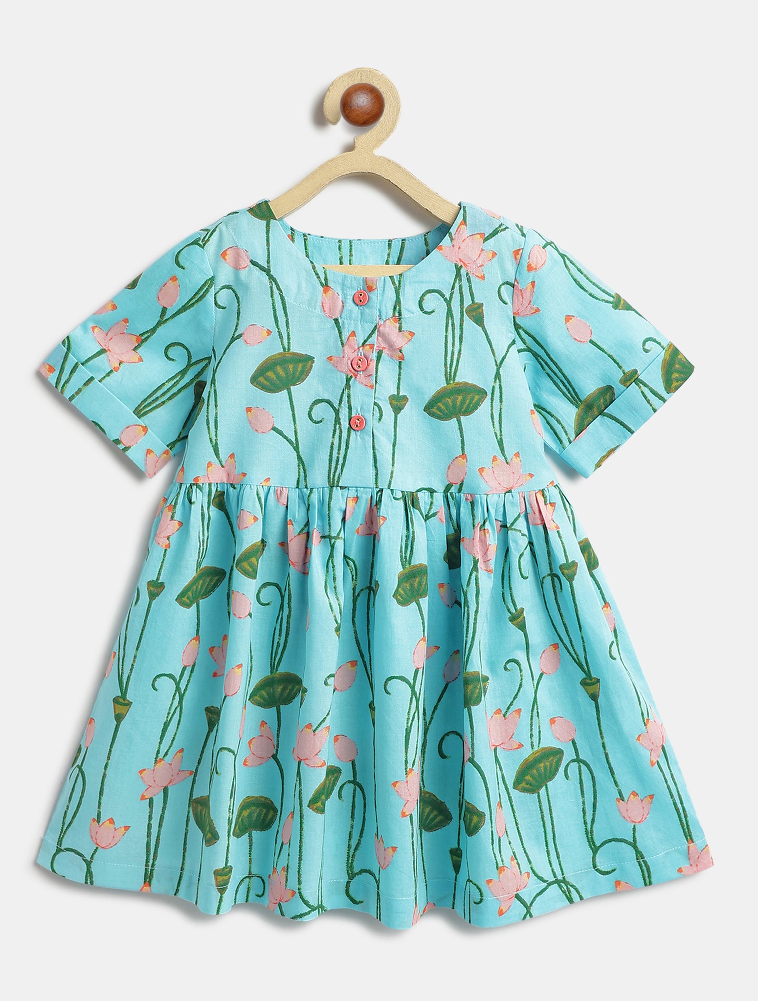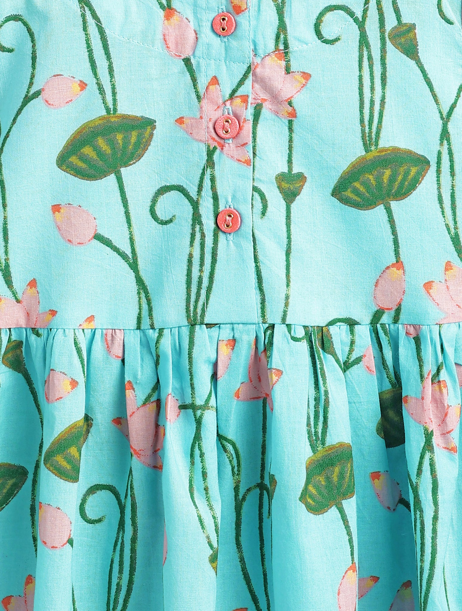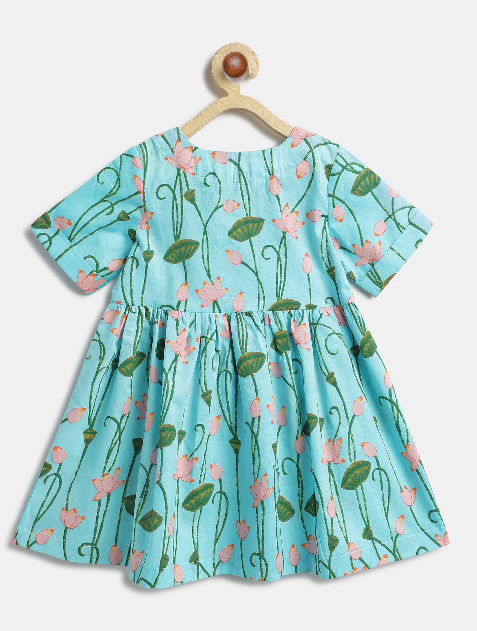 Turquoise blue lotus printed girls dress in pure cotton fabric.