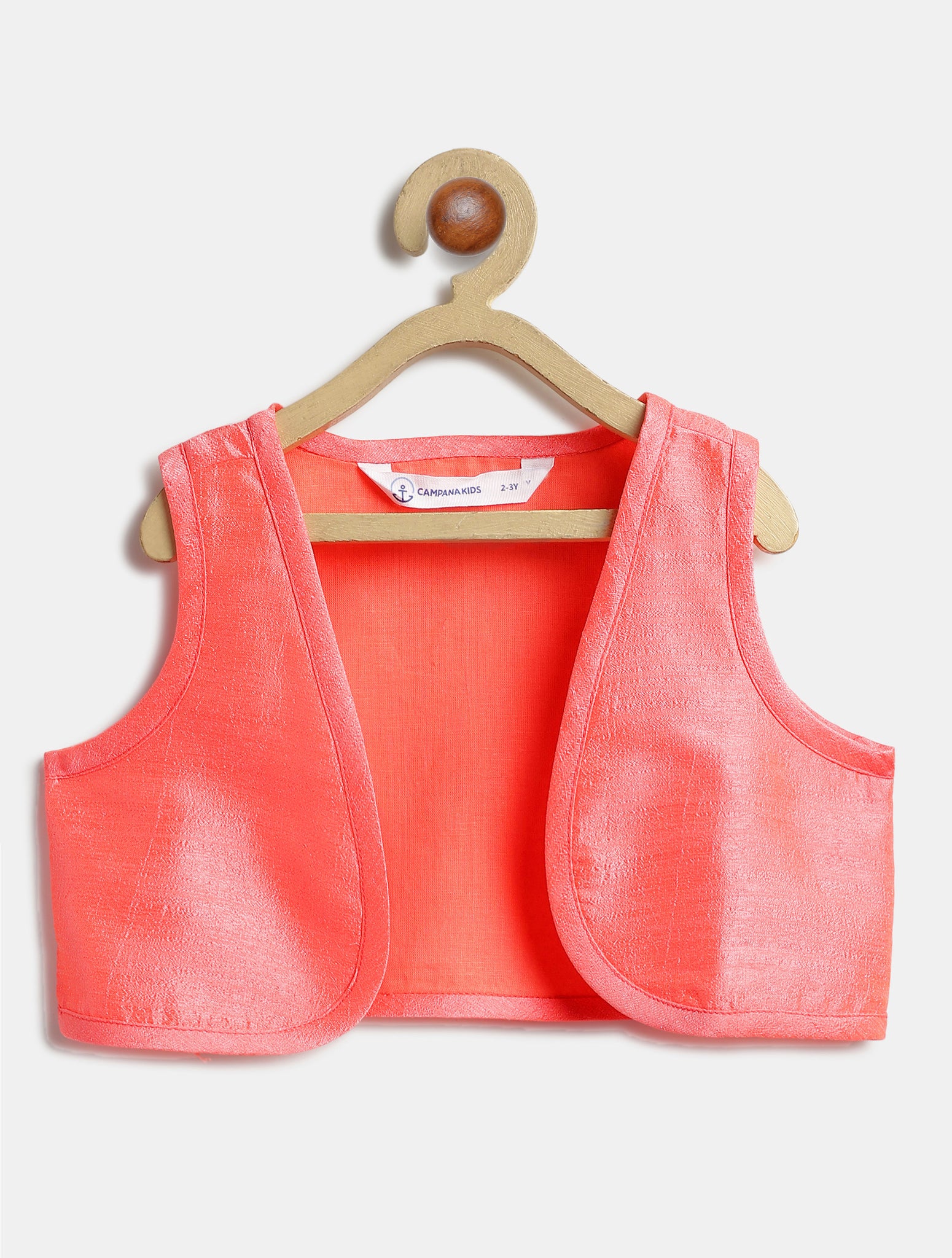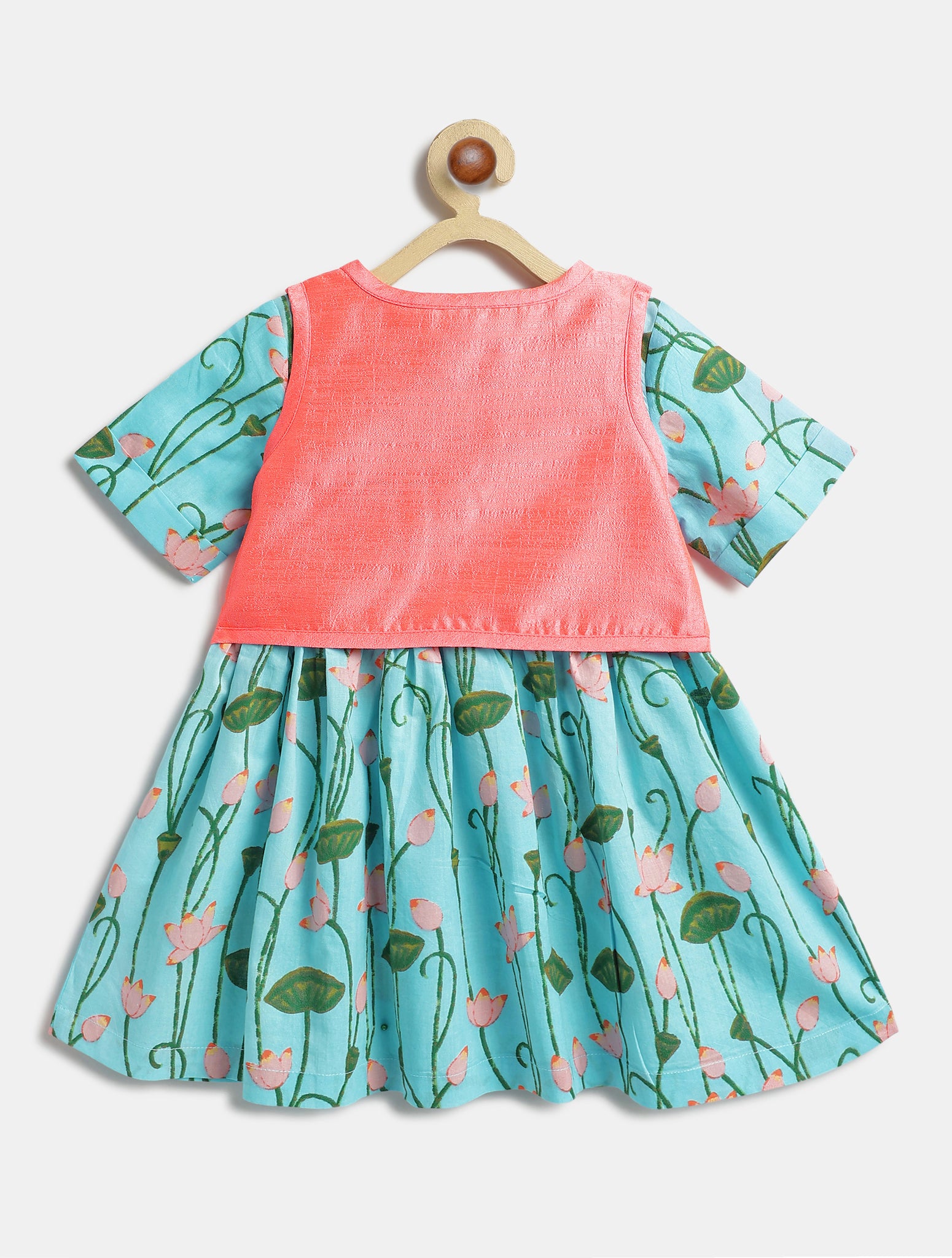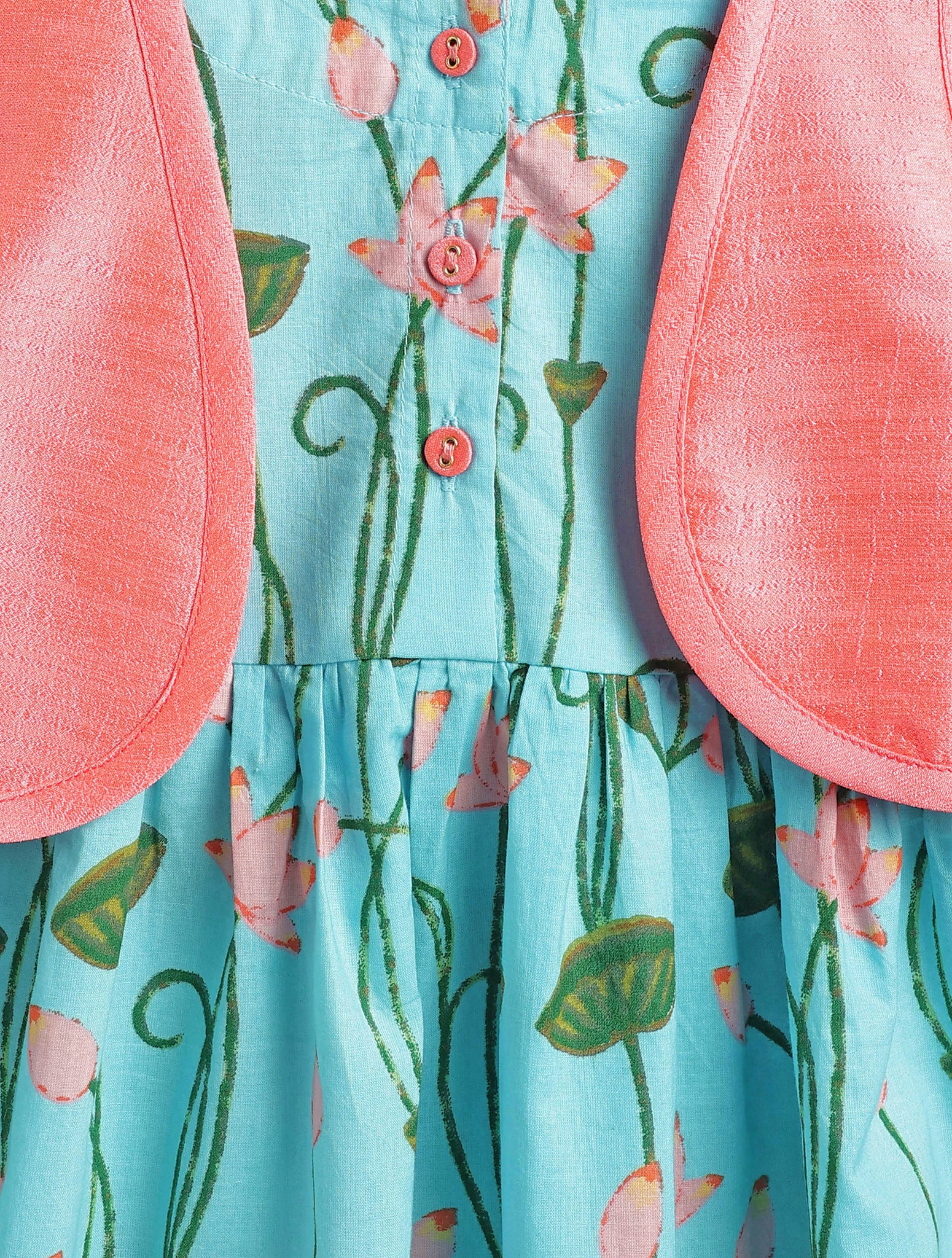 Campana Girls Zoe Cotton Dress with Short Jacket - Lotus Print - Light Blue & Pink