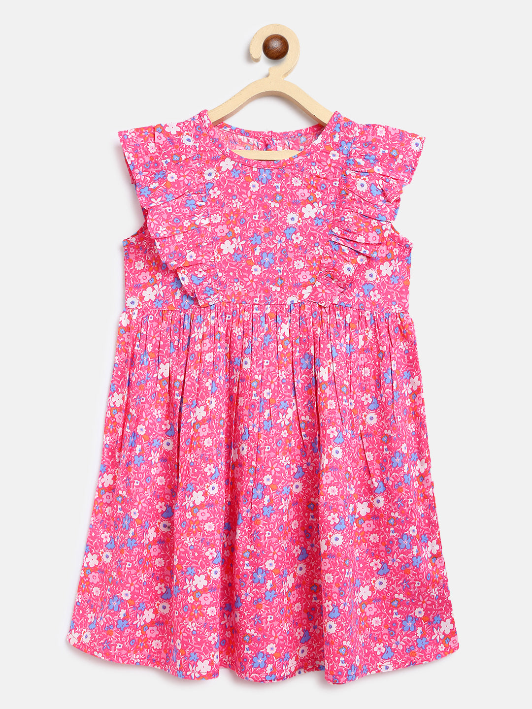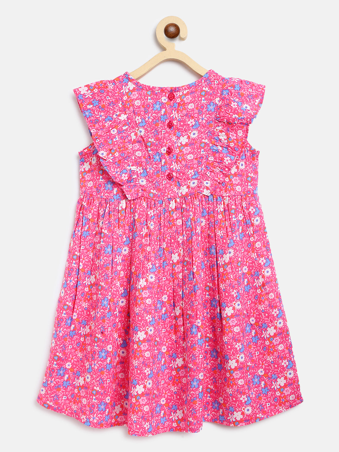 With trendy frills, this dress is sure to become one of her favorites. It features a busy floral print and has frills on the front. With a back button closure, this dress is made in soft viscose rayon fabric.