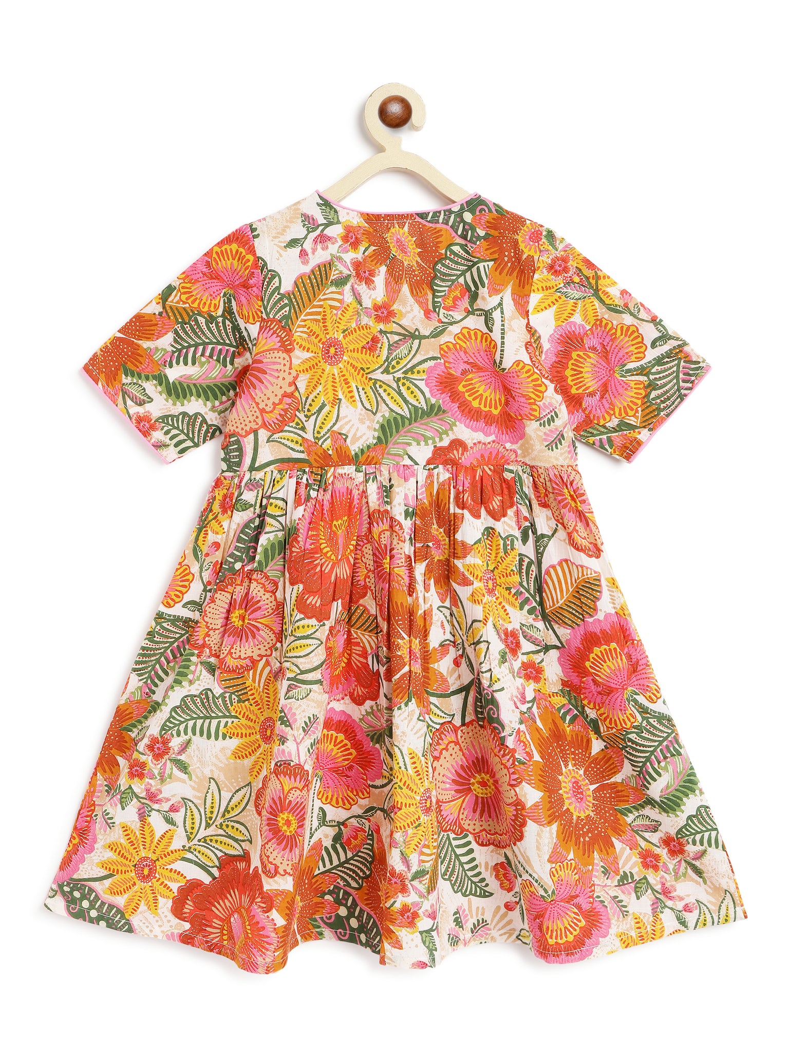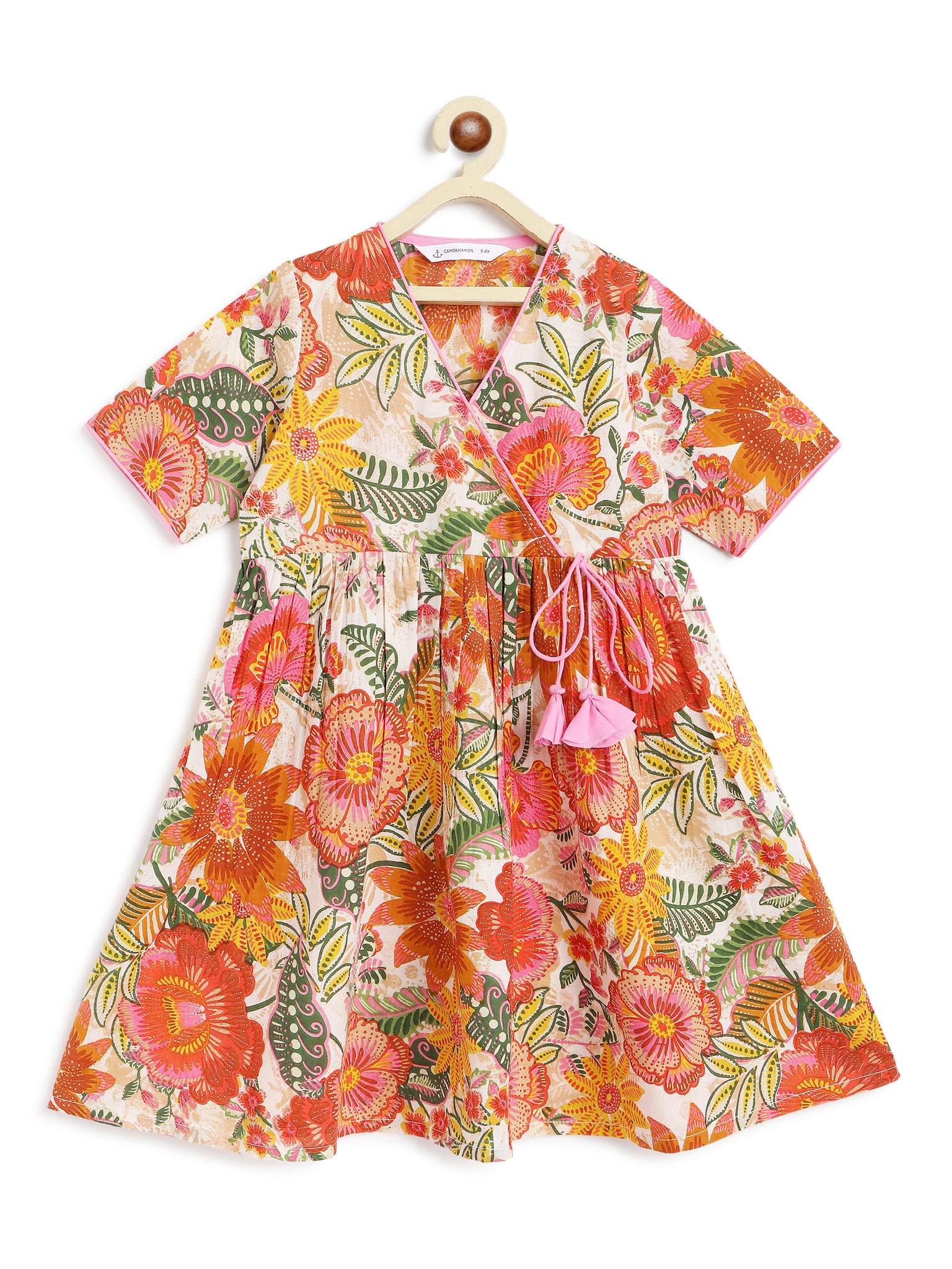 This flared kurta can be paired with her favourite leggings or trousers to create an easy festive outfit. It features cross-over angrakha styling with waist tie-ups, short sleeves and contrast detailing around the neck & sleeves. Its flared hemline makes for a flowy and twirly silhouette. With a front opening, this kurta falls just below knee. Made in 100% soft, printed cotton.