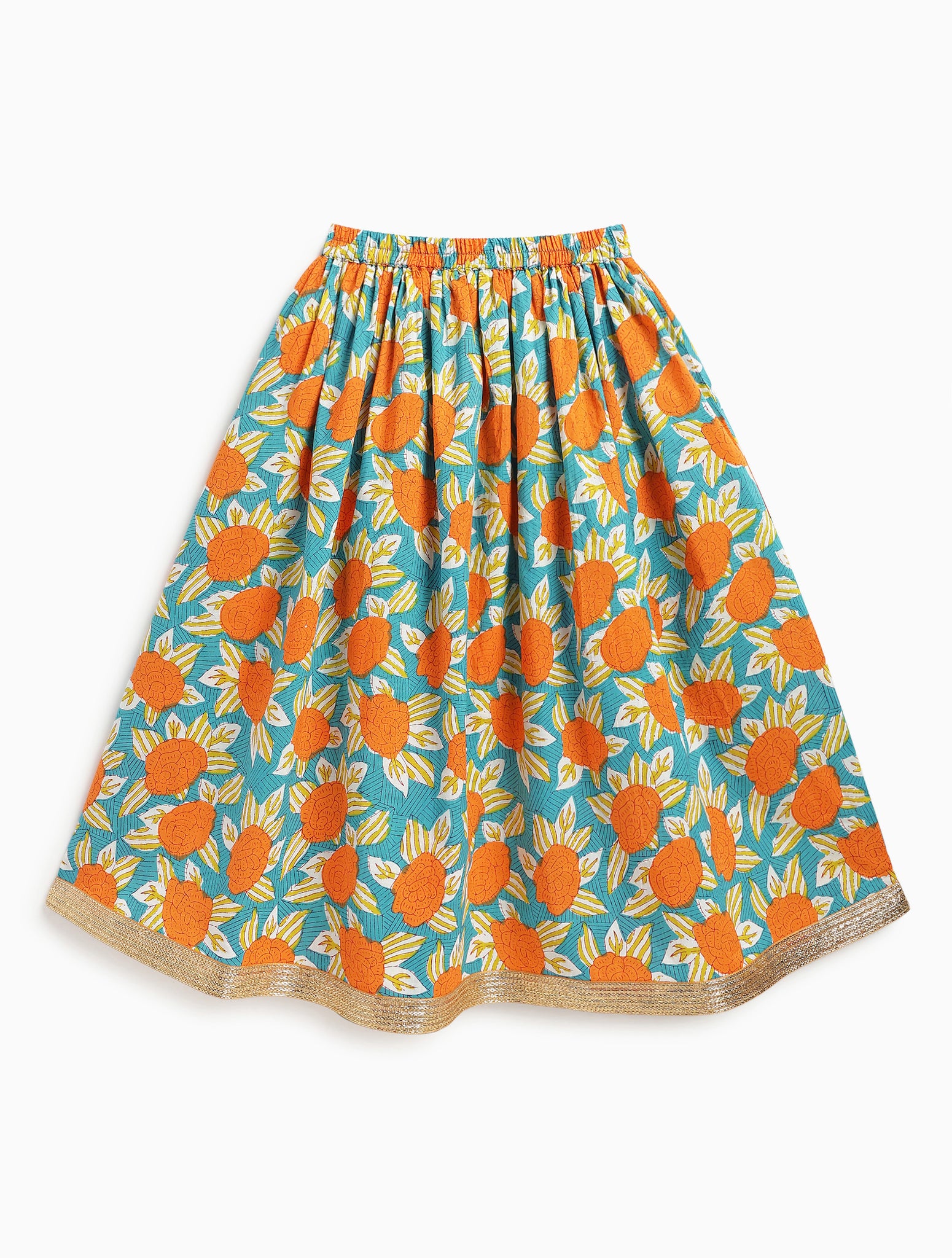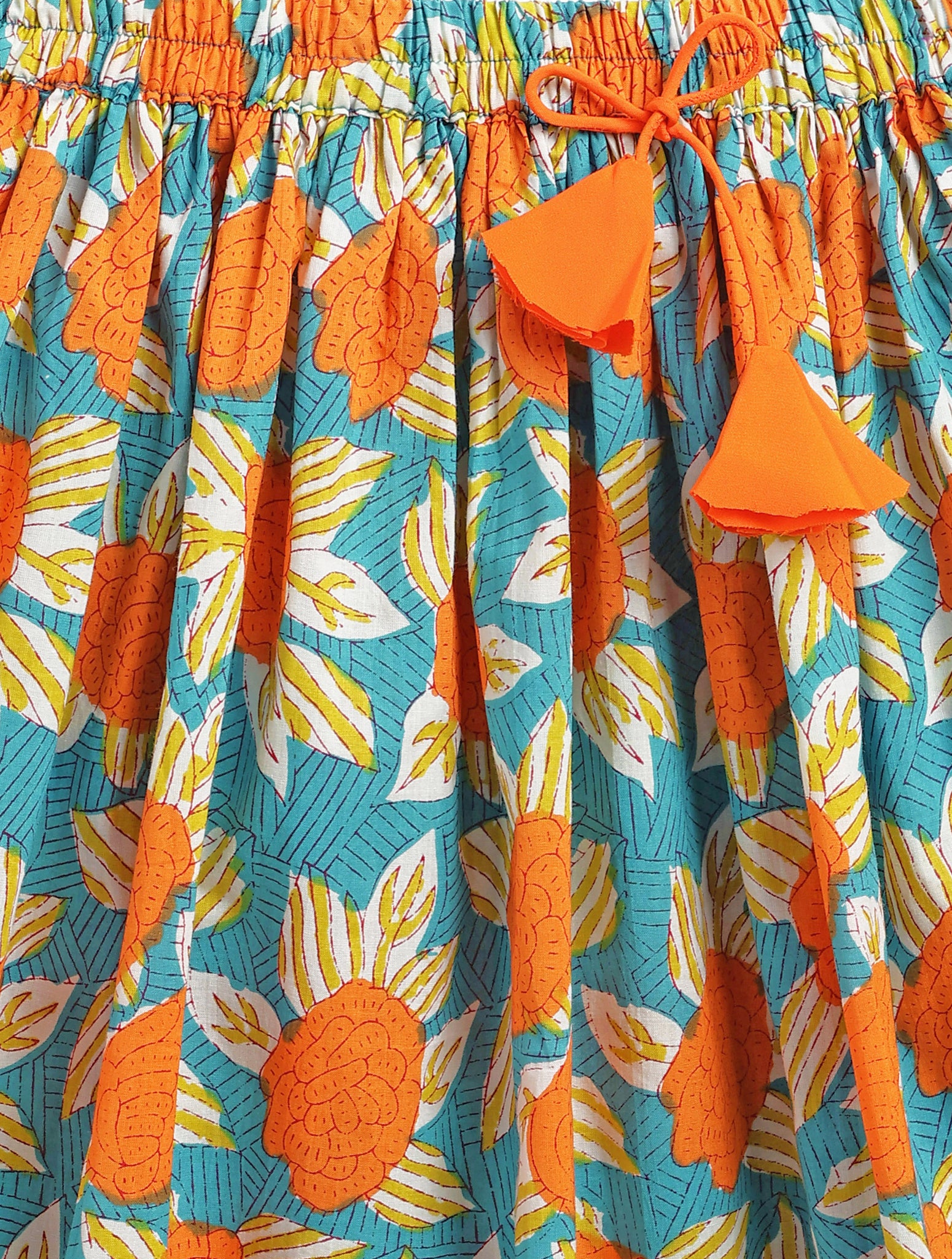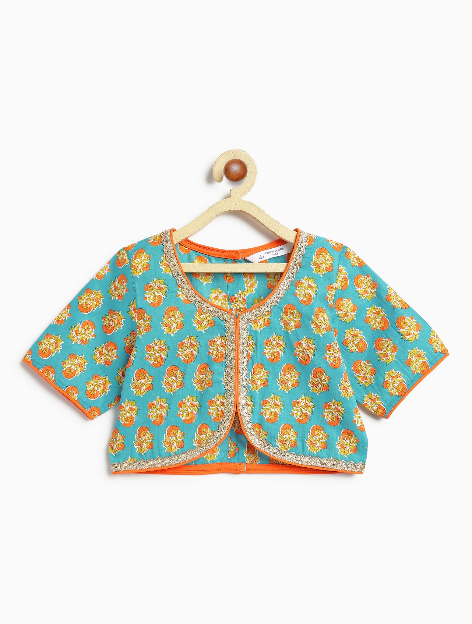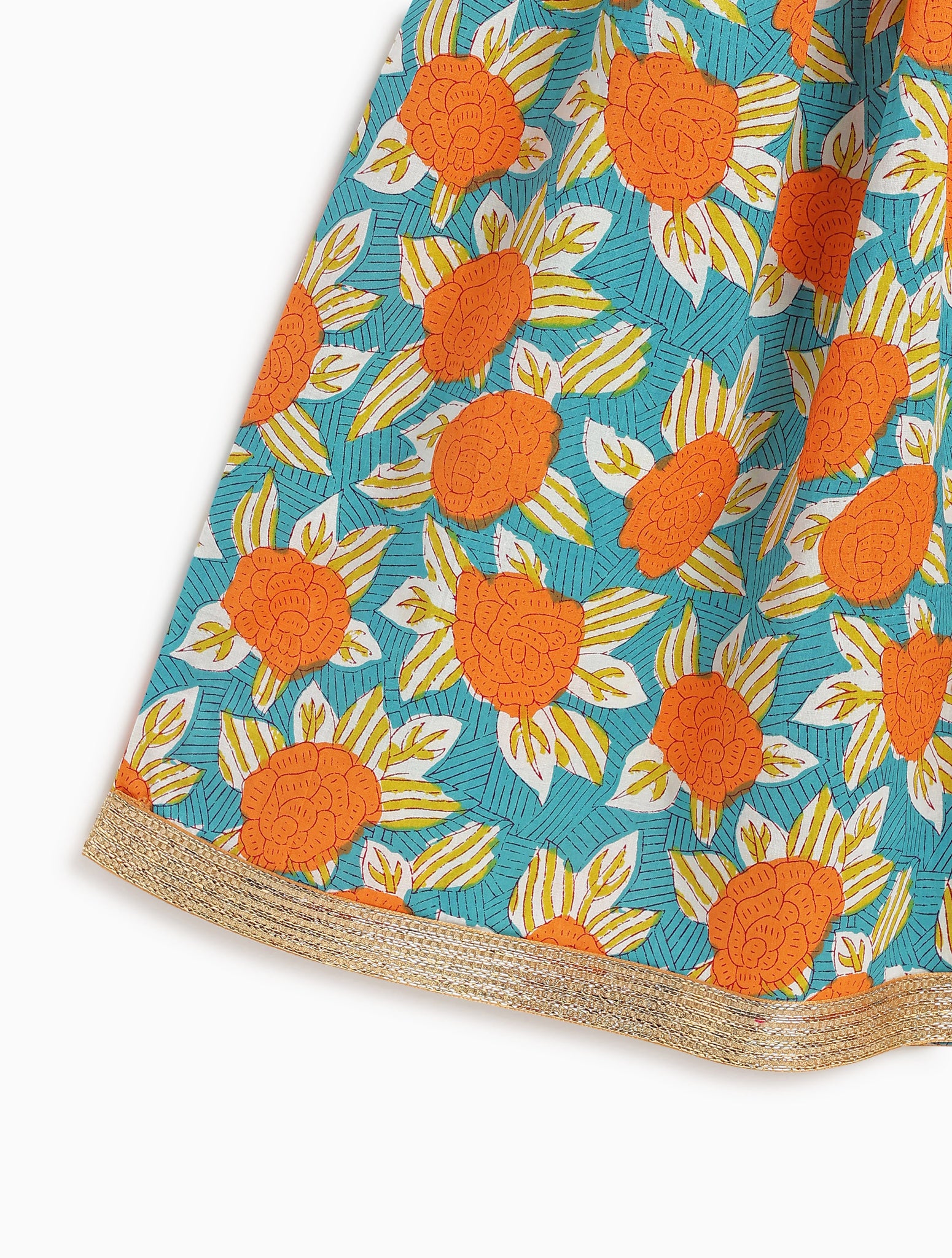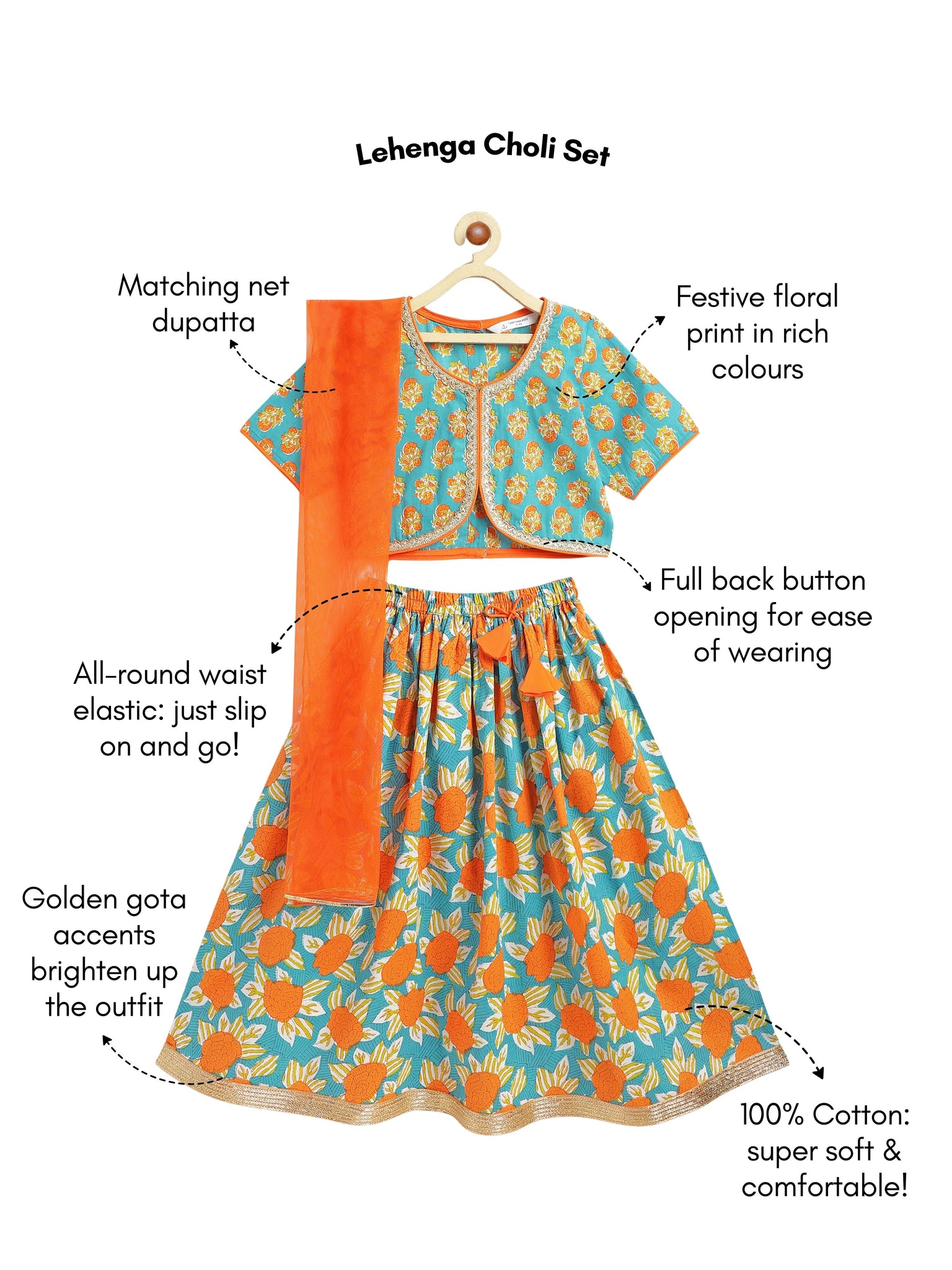 Blue & orange floral printed girls lehenga choli set in pure cotton fabric.
