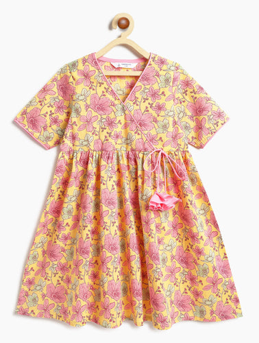 Campana Girls Sanjana Floral Print Flared Cotton Kurta - Yellow & Pink