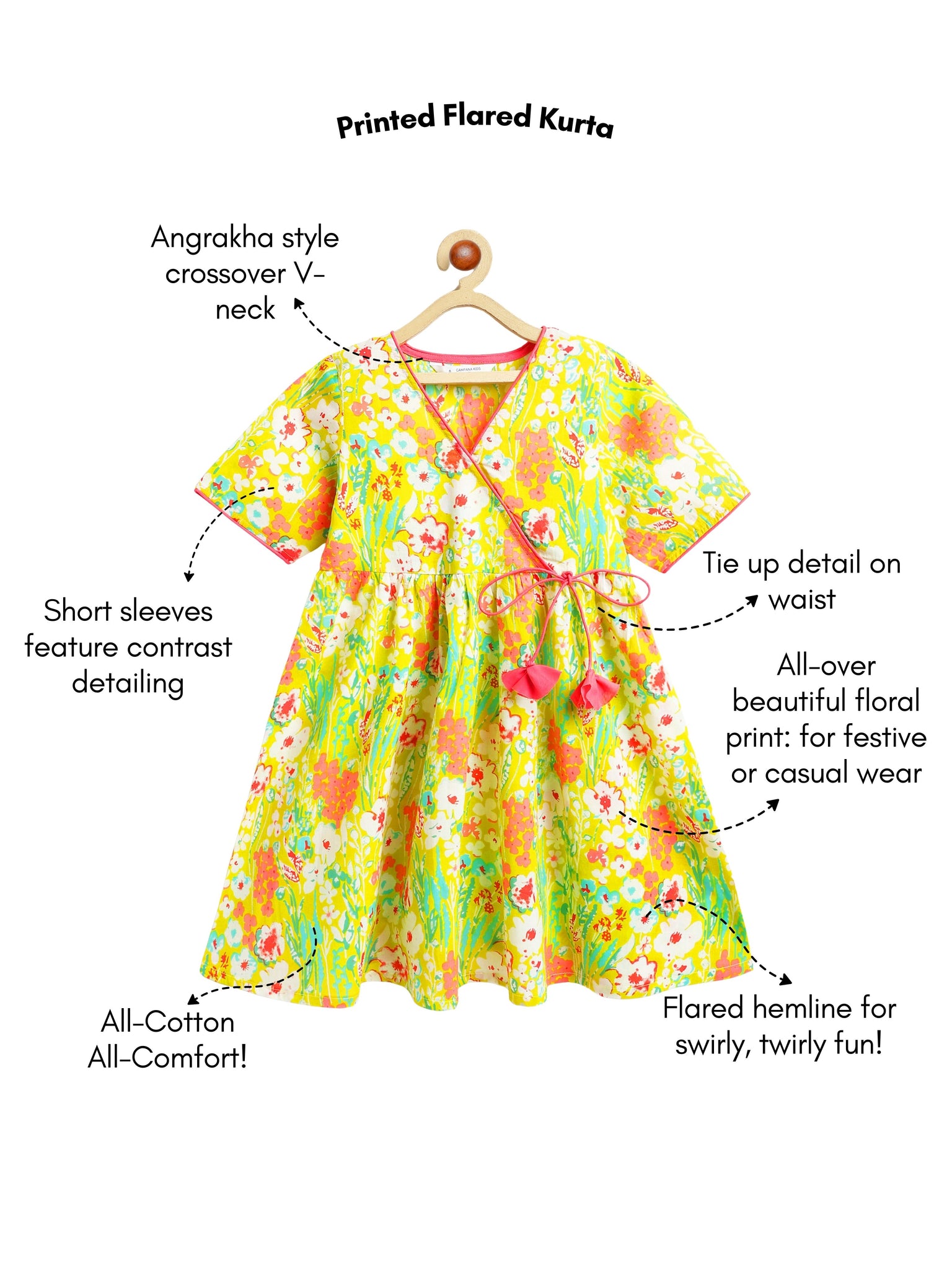 Lime green & multicolour floral printed girls kurta in pure cotton fabric.