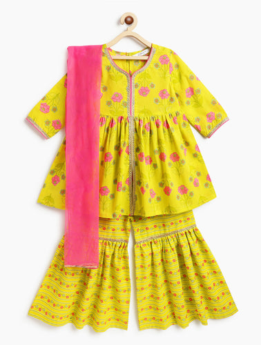 Campana Girls Uma Flared Kurta Sharara Set - Flowers & Stripes - Lime Green & Pink