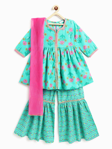 Campana Girls Uma Flared Kurta Sharara Set - Flowers & Stripes - Turquoise & Pink